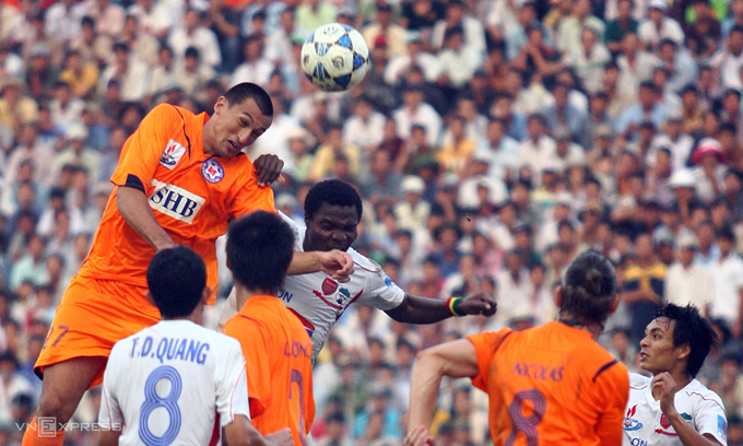 Đỗ Merlo (áo cam - trái) là hiện thân cho hiệu quả ngắn hạn của chiến thuật phất bóng cho ngoại binh trên tuyến đầu ở V-League hơn 10 năm qua. Ảnh: Đức Đồng.