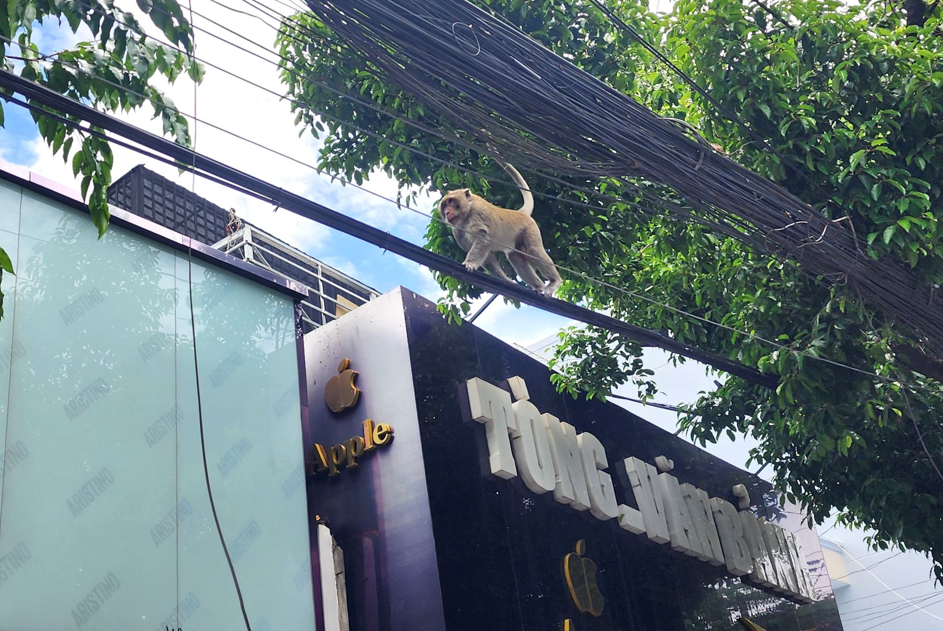 Khỉ đi trên hệ thống dây cáp quang dọc theo đường Cách Mạng Tháng Tám
