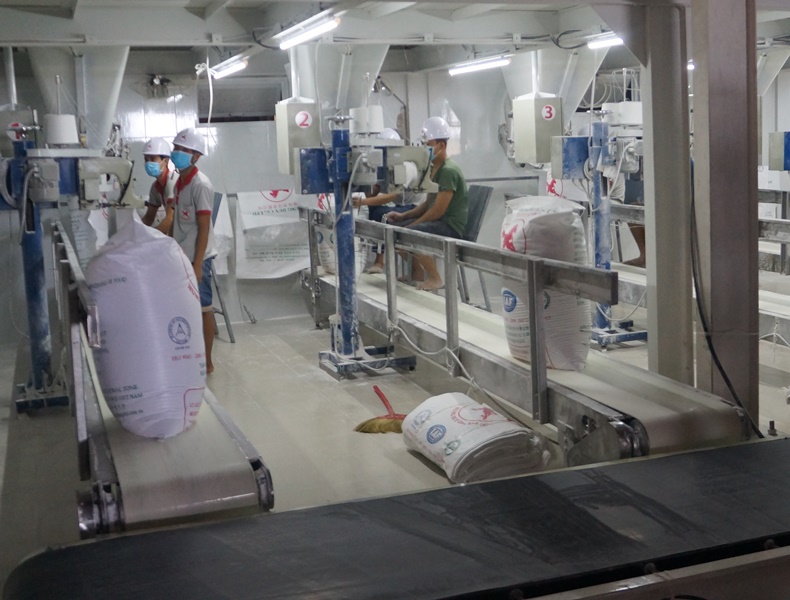 Đóng gói sản phẩm bột mì tại nhà máy sản xuất của Chi nhánh Công ty TNHH TM DV CN Hùng Duy 8 tại xã Ninh Điền, huyện Châu Thành.