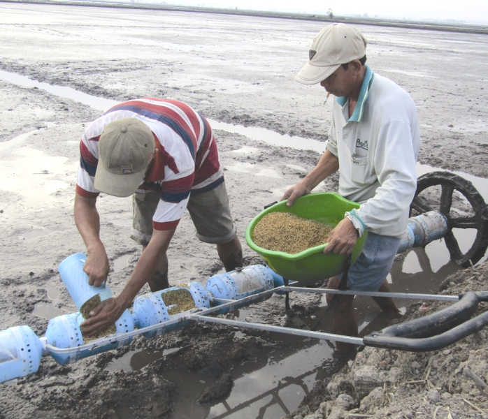 Ông Cồn (người bưng thau lúa) - Tổ trưởng Tổ hợp tác sản xuất lúa giống xã Cẩm Giang cho lúa vào các trống đựng lúa của trục sạ hàng để xuống giống.