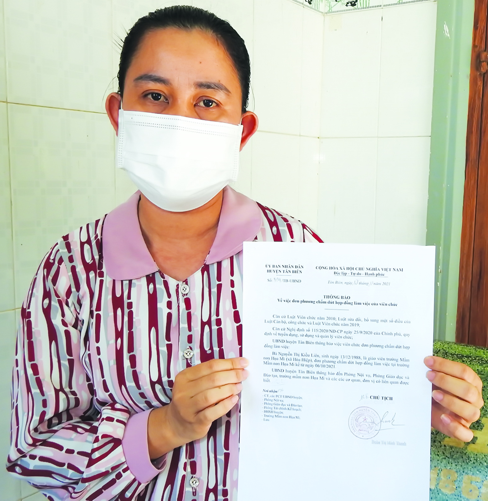 Theo đơn của bà Liên gửi đến Báo Tây Ninh, việc UBND huyện Tân Biên ban hành công văn như trên là trái với quy định tại điểm a, khoản 1 Điều 35 Bộ luật Lao động năm 2019. Ngoài ra, còn trái với quy định tại khoản 4, Điều 29; điểm d, khoản 5 và khoản 6 Điều 29 Luật Viên chức năm 2010 (có hiệu lực thi hành từ ngày 1.1.2012).