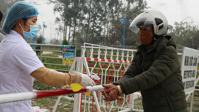 Người ra vào chốt kiểm dịch xã Sơn Lôi, Vĩnh Phúc, được nhân viên y tế xịt khử trùng tay phòng dịch. Ảnh: Ngọc Thành.