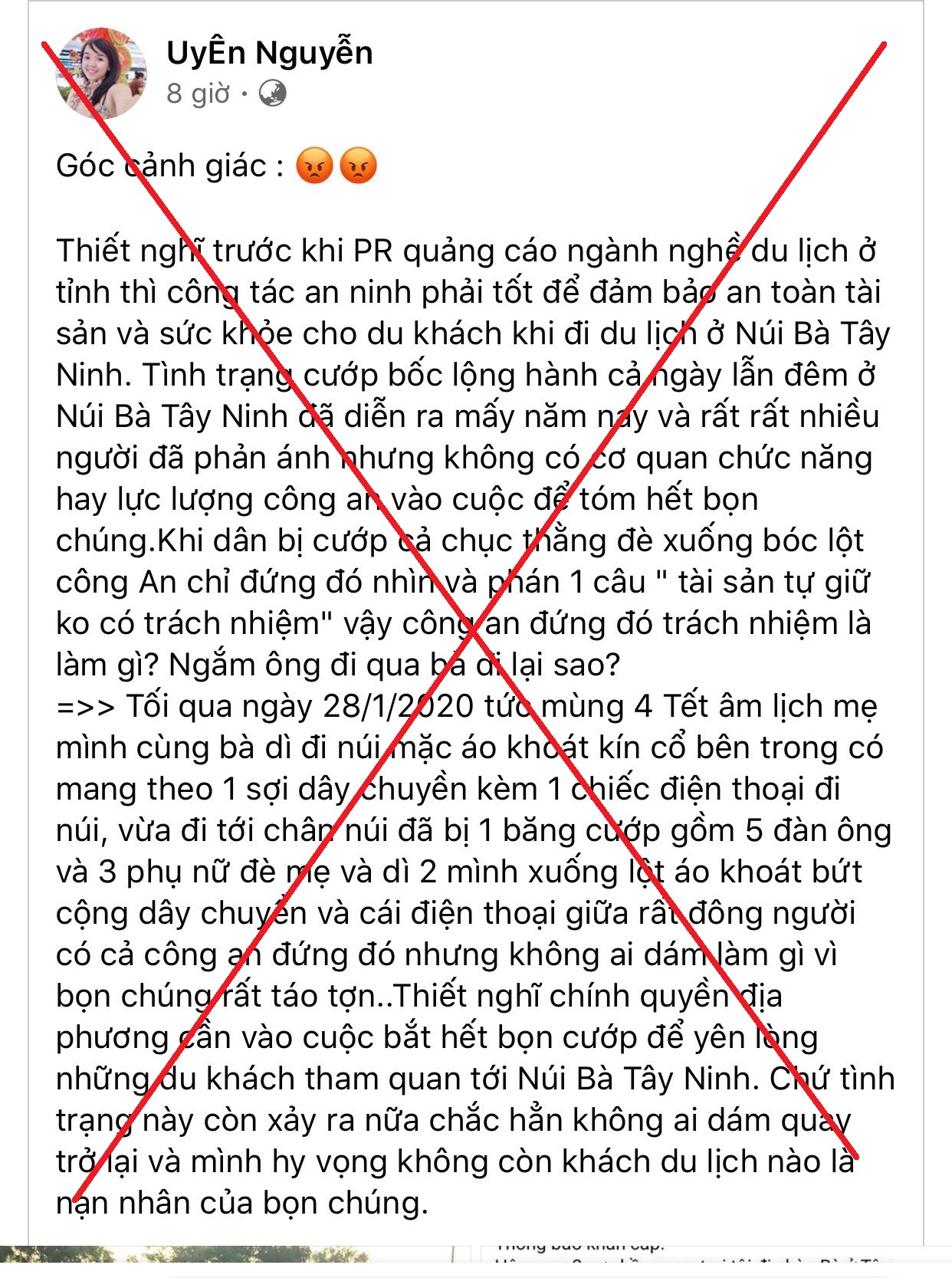 Như vậy, có thể khẳng định những thông tin mà chủ tài khoản này là không chính xác. Việc đăng tải thông tin chưa qua kiểm chứng đã làm hoang mang dư luận, gây ảnh hưởng an ninh trật tự xã hội, ảnh hưởng đến tâm lý du khách khi đến tham quan Khu du lịch quốc gia núi Bà Đen và hình ảnh du lịch Tây Ninh.