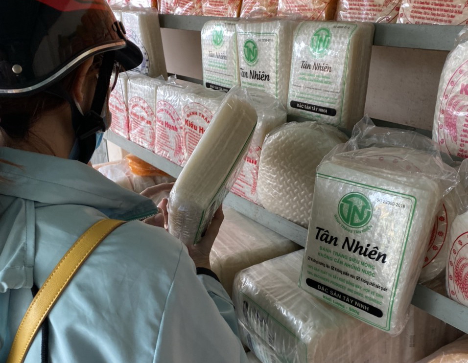 Phóng viên đi tìm hiểu thực tế bánh tráng Tân Nhiên giả nhãn hiệu được bán tại một điểm kinh doanh tại một điểm bán trên đường 784, xã Chà Là, huyện Dương Minh Châu.