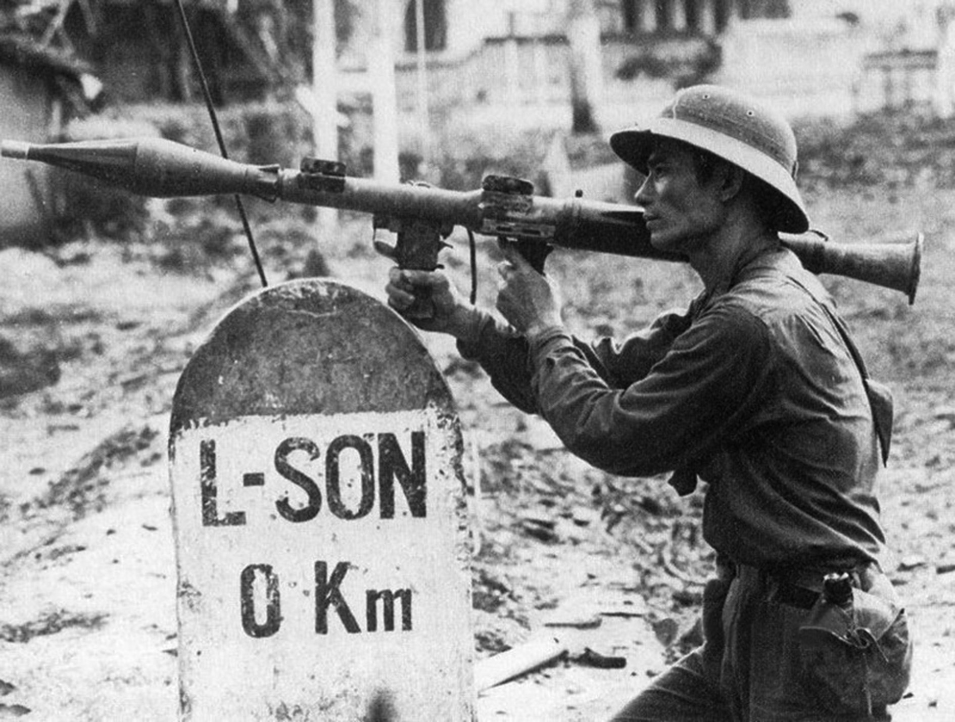 Hình ảnh người chiến sĩ cầm súng B41 hướng về phía quân xâm lược, bên cạnh là cột mốc số 0 Lạng Sơn, rạng sáng 17.2.1979 mang tính biểu tượng về cuộc chiến đấu bảo vệ biên giới phía Bắc năm 1979. Ảnh: TTXVN
