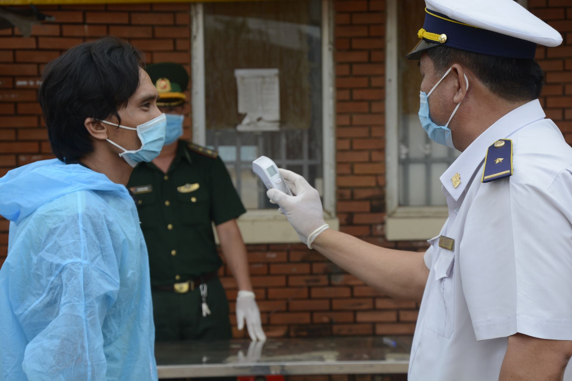 Cán bộ Trung tâm Kiểm dịch y tế quốc tế Tây Ninh đo thân nhiệt cho người xuất nhập cảnh qua cửa khẩu quốc tế Xa Mát, huyện Tân Biên. Ảnh: Phương Thuý