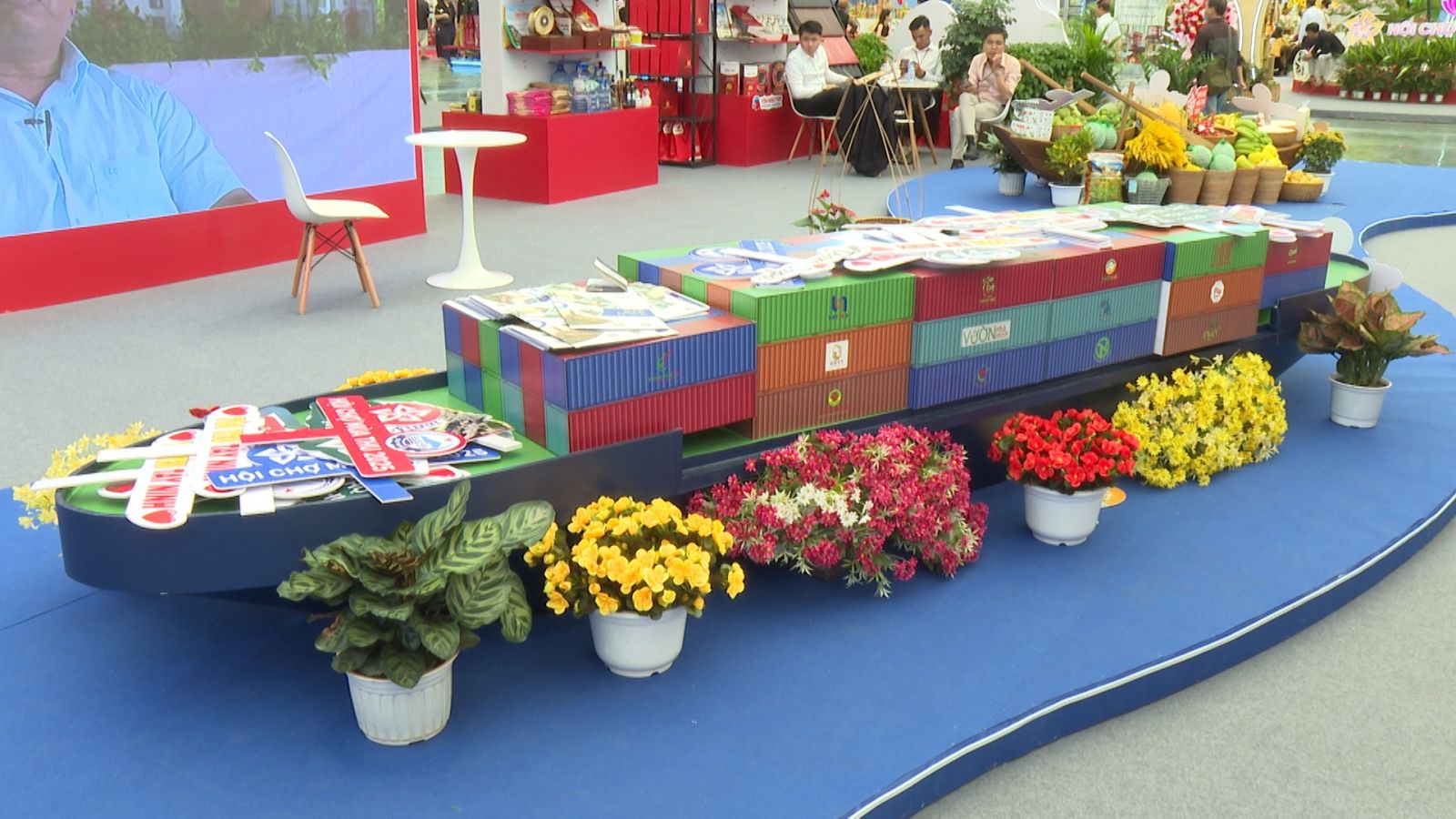 Giữa trung tâm không gian là biểu tượng “Dòng sông Vàm Cỏ” được tái hiện bằng mô hình 3D mềm mại, uốn lượn quanh những thuyền ba lá chở đầy nông sản, tàu container mang logo doanh nghiệp - ẩn dụ cho hành trình phát triển từ nông nghiệp truyền thống đến công nghiệp hiện đại.