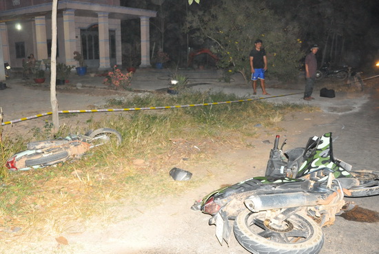 Tại hiện trường, chiếc xe Exciter của thanh niên bể nát phần đầu và yếm xe, còn xe máy của người phụ nữ bị hất văng xuống lề đường.