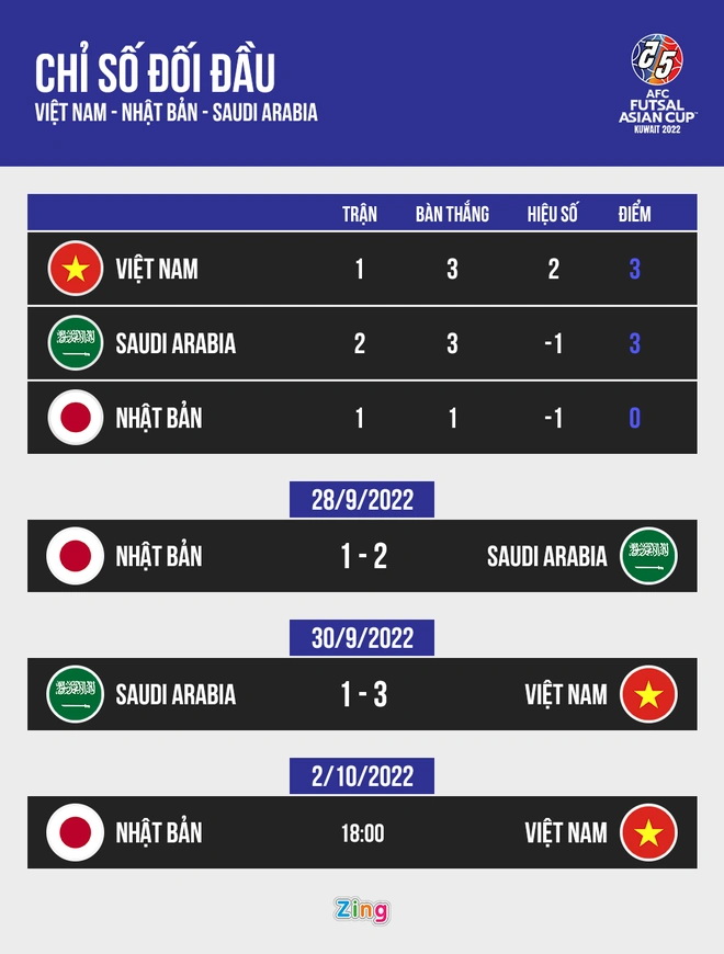 Nếu tuyển futsal Việt Nam để thua Nhật Bản với cách biệt một bàn, hiệu số bàn thắng - bại trong những trận đối đầu nhau của Việt Nam, Saudi Arabia và Nhật Bản sẽ lần lượt là +1, -1 và 0. Hai đội đi tiếp là Việt Nam và Nhật Bản. Đoàn quân HLV Giustozzi chiếm ngôi đầu bảng.