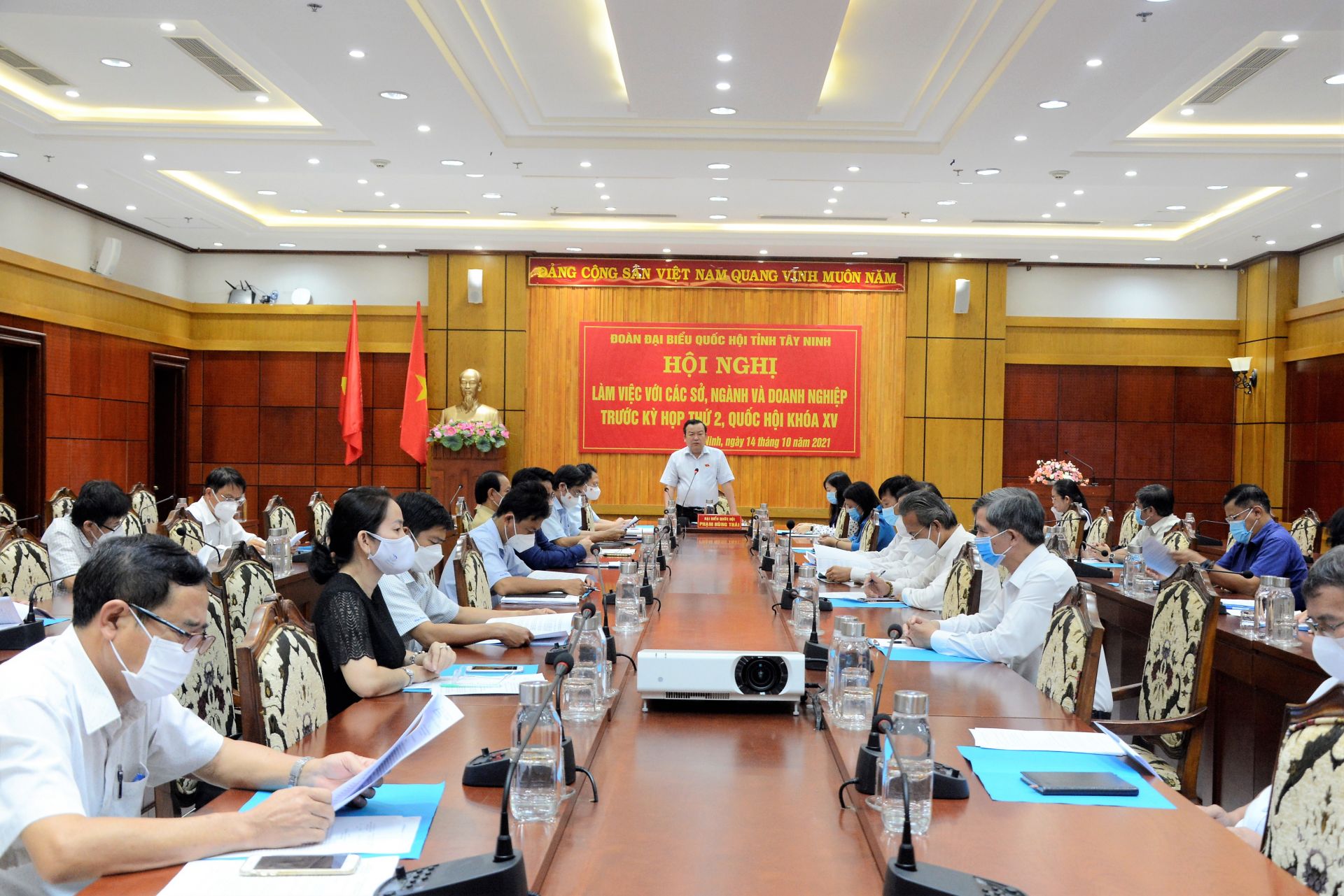 Chiều 14.10, ông Phạm Hùng Thái - Phó Bí thư Thường trực Tỉnh uỷ, Trưởng Đoàn ĐBQH đơn vị tỉnh chủ trì buổi làm việc của Đoàn ĐBQH tỉnh với các sở, ngành, doanh nghiệp trước kỳ họp thứ 2, Quốc hội khoá XV. Cùng dự có các ĐBQH: Hoàng Thị Thanh Thuý- Phó Trưởng đoàn chuyên trách Đoàn ĐBQH đơn vị tỉnh, Huỳnh Thanh Phương- Bí thư Huyện uỷ Gò Dầu, Trần Hữu Hậu - Hội viên Hội Luật gia tỉnh và lãnh đạo các sở, ngành, các doanh nghiệp (DN) trên địa bàn tỉnh.