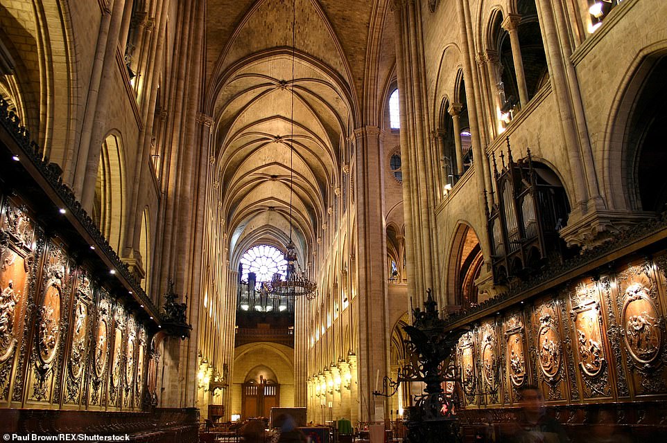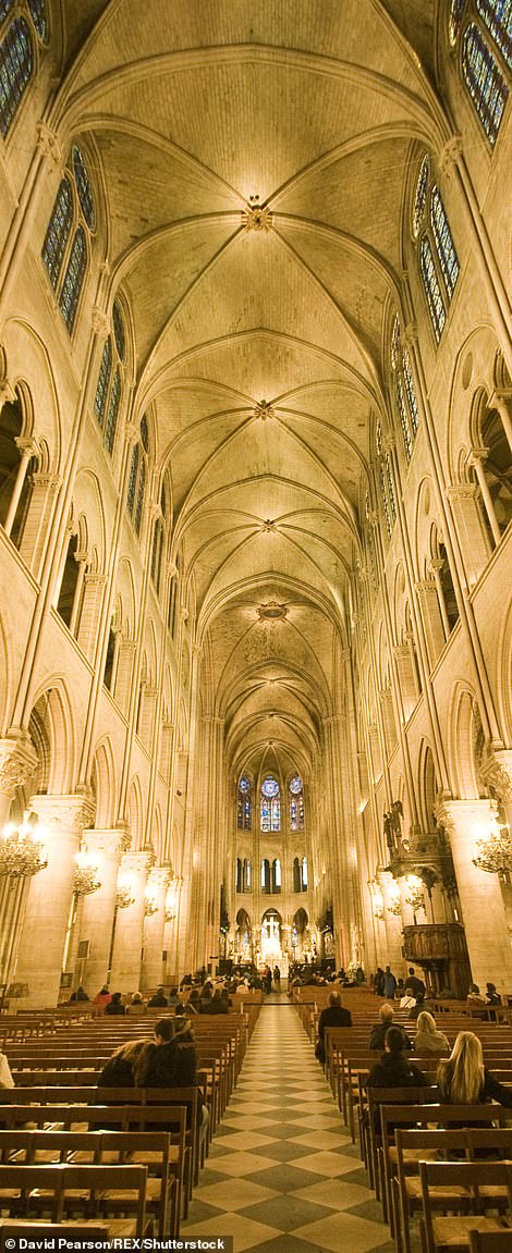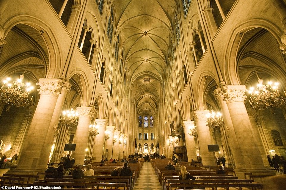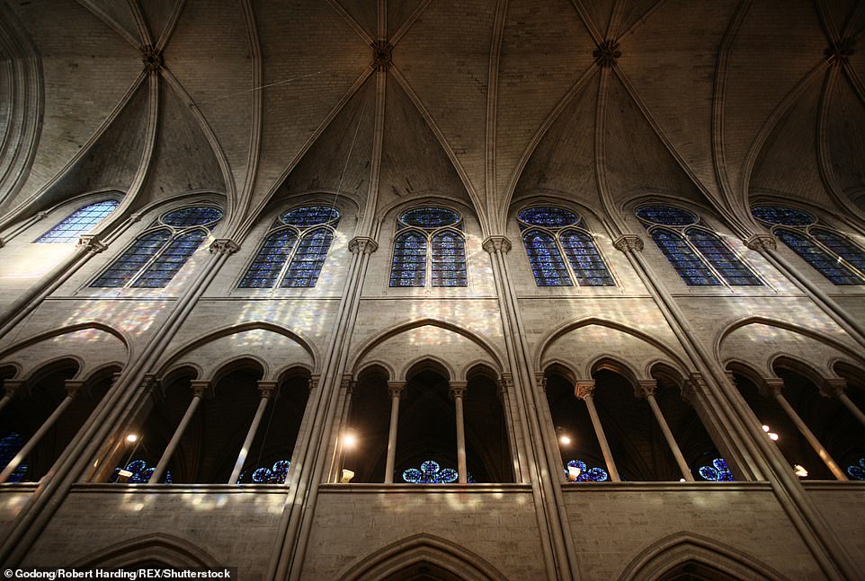 Bên trong Nhà thờ Đức Bà Paris (Notre Dame de Paris), được xây dựng bên bờ sông Seine từ năm 1163 và mất hơn 200 năm mới hoàn thành. (Ảnh: Rex/Shutterstock)