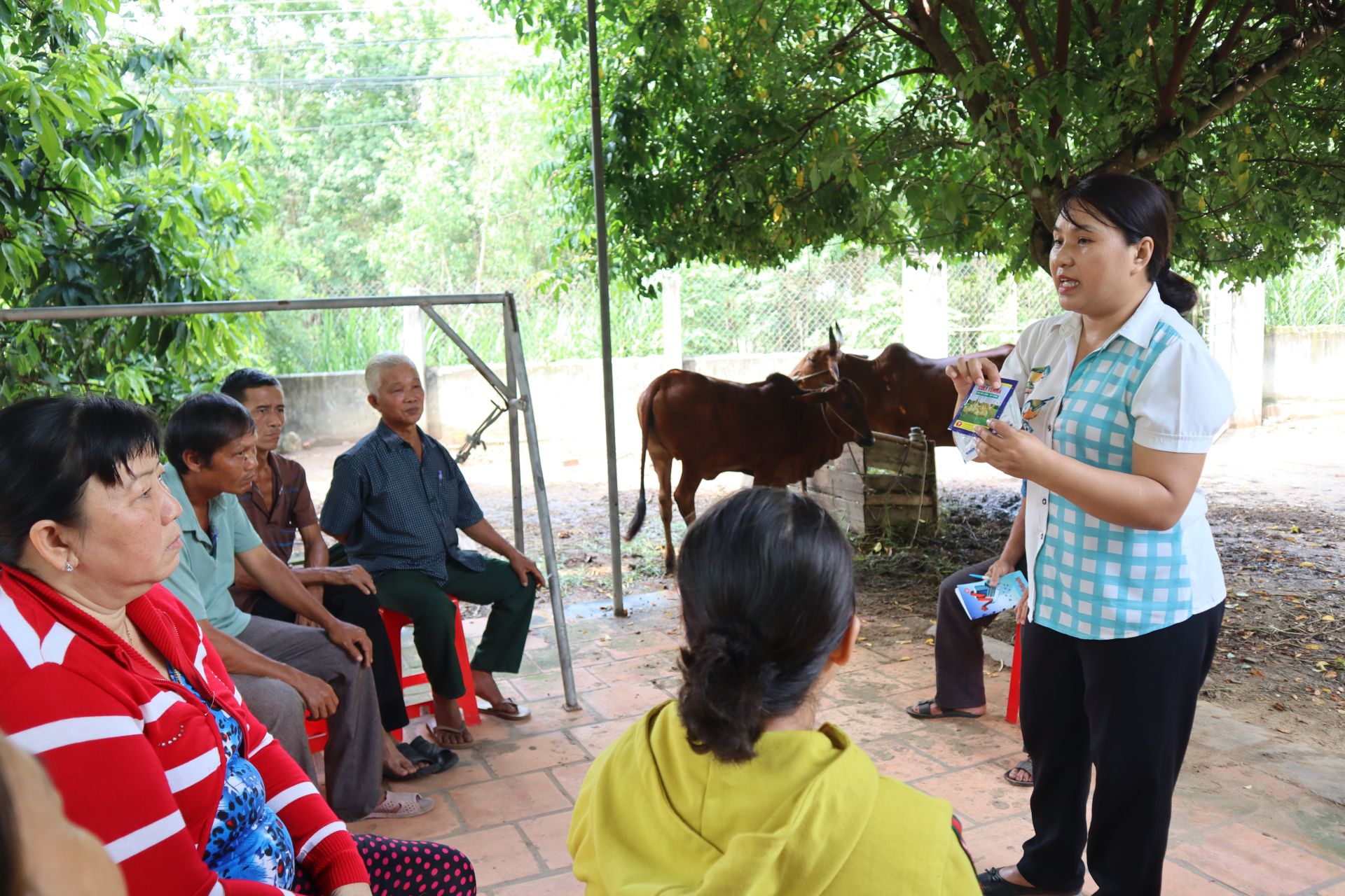 Giáo viên Trường trung cấp Kinh tế - Kỹ thuật Tây Ninh hướng dẫn kỹ thuật chăn nuôi cho bà con nông dân. Ảnh: Ngọc Bích