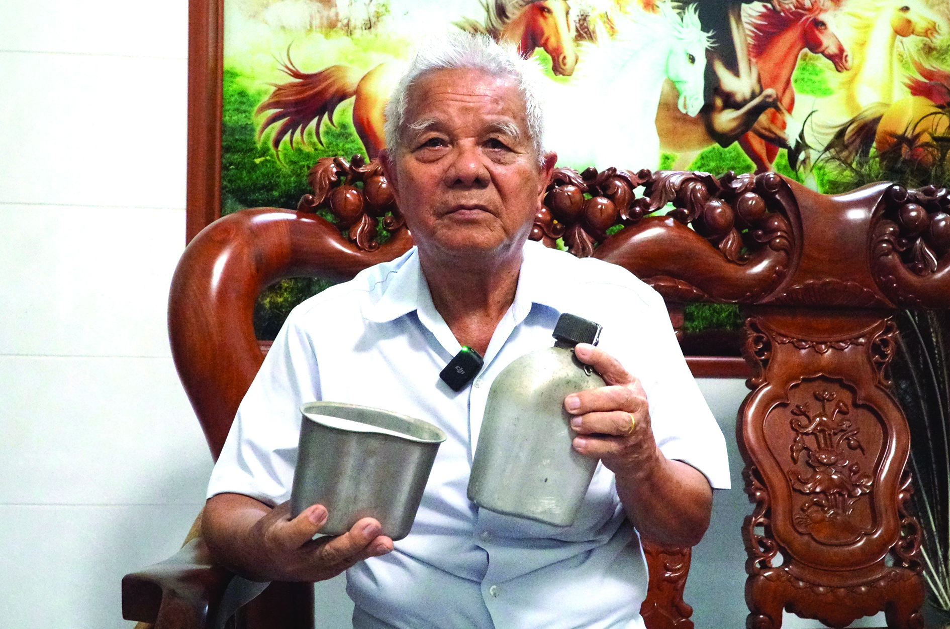 Ông Lê Văn Út kể về chiếc bình toong đựng nước của người em trai đã hy sinh.