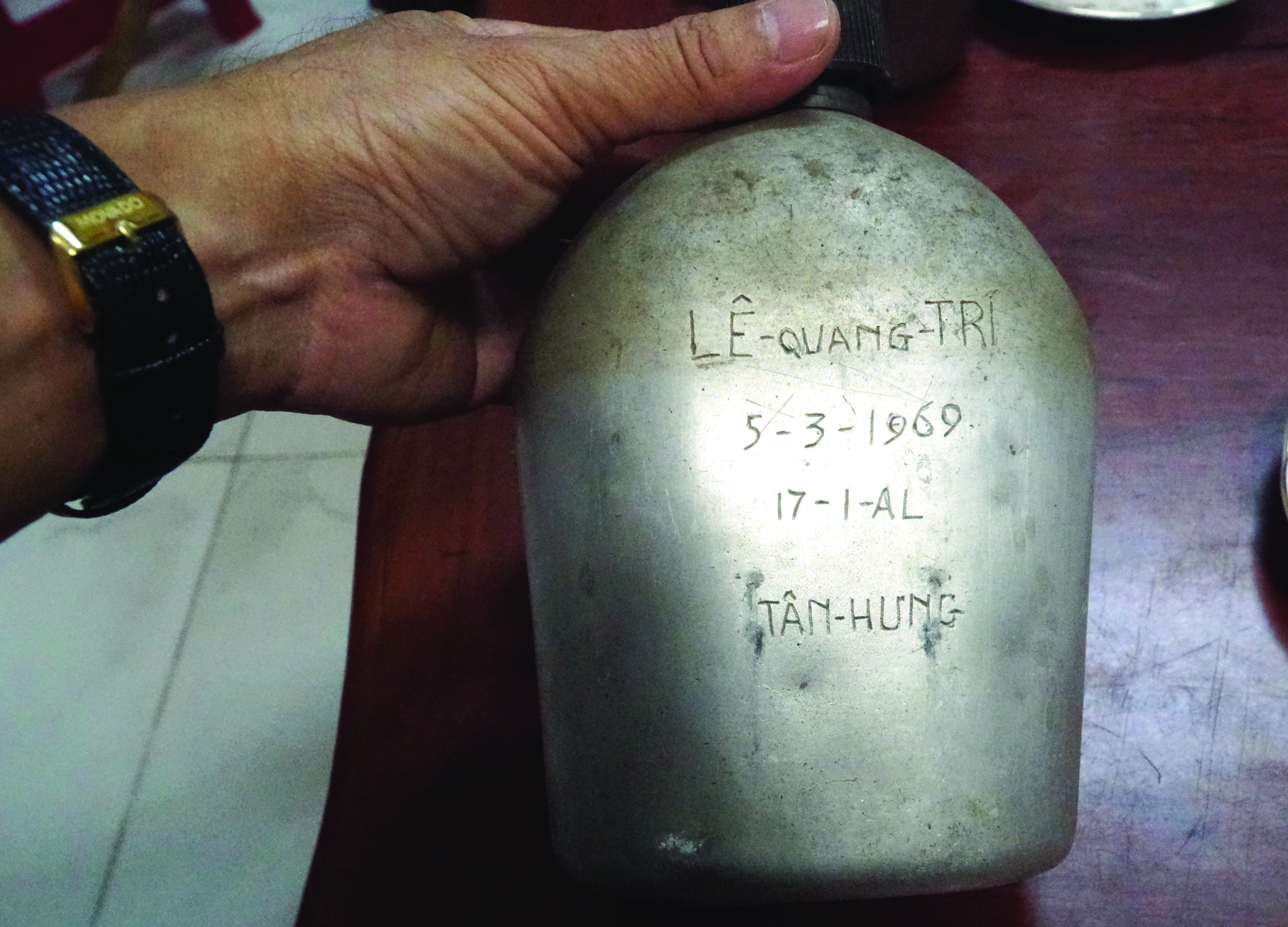 Hiện nay, ông Út còn cất giữ một số kỷ vật thời chiến tranh. Lấy ra cho chúng tôi xem chiếc bình toong đựng nước, bên ngoài có khắc dòng chữ: “Lê Quang Trí. 5-3-1969. 17-1 AL”, ông kể, em trai của ông tên Lê Văn Trạch, khi đi kháng chiến, đổi tên Lê Quang Trí. Em trai của ông là cán bộ dân chính, thuộc Ban Tuyên huấn Huyện uỷ Toà Thánh (thị xã Hoà Thành ngày nay) và cũng từng sống, chiến đấu ở động Kim Quang. Ngày 5.3.1969, đoàn cán bộ đi từ khu rừng 48 lên núi Bà Đen, em trai của ông đi trước. Khi đoàn công tác cách ngã ba Khedol khoảng 400-500m thì lọt vào ổ phục kích của địch. Em trai của ông bị bắn chết tại chỗ. Quân cách mạng không thể vào lấy xác em đem về chôn cất được, người dân địa phương đào đất chôn tạm bên đường. Những năm sau đó, quân Mỹ ủi rộng hai bên lề đường, ngôi mộ của em trai ông bị mất dấu vết. Đến nay đã hơn 50 năm trôi qua, gia đình, đơn vị vẫn chưa tìm thấy hài cốt. Thương nhớ đồng đội, ông Bảy Phú- Chánh Văn phòng Huyện uỷ Toà Thánh thời bấy giờ đã khắc tên em trai của ông vào chiếc bình toong mà chủ nhân của nó thường sử dụng.