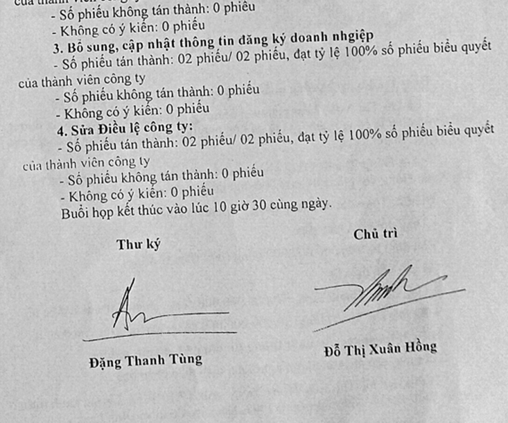 Sau khi anh em nhà họ Đặng “ra giấy chứng nhận” Công ty Việt Dương hai thành viên trở lên, trong đó bà Hồng góp vốn 70%, làm Chủ tịch Hội đồng thành viên kiêm Giám đốc công ty, bà Đỗ Thị Xuân Hồng đã nhanh chóng chuyển cho ông Đặng Thanh Tùng cả chục tỷ đồng góp vốn. Tuy nhiên, không lâu sau đó, bất ngờ bà Hồng phát hiện được “cái công ty do mình làm chủ tịch” đã có 2 lần thay đổi đăng ký kinh doanh nữa! Thế là bà Hồng trở thành thành viên góp vốn 30%, và tất nhiên bà bị mất luôn chức chủ tịch hội đồng thành viên. Qua tìm hiểu, chúng tôi được biết tất cả những hồ sơ thay đổi đăng ký kinh doanh của Công ty Việt Dương lần thứ 12, thứ 13 đều bị làm giả. Cụ thể, hồ sơ thay đổi đăng ký lần thứ 12 thể hiện bà Hồng và ông Tùng ký hợp đồng chuyển nhượng phần góp vốn vào ngày 29.12.2014 với nội dung “bà Hồng bán 40% tỷ lệ góp vốn (tương đương 40 tỷ đồng) cho ông Tùng”. Hồ sơ thể hiện có biên bản họp thành viên hội đồng, trong đó nêu ý kiến người đồng ý bán là bà Hồng, người mua là ông Tùng nhưng cuối biên bản, ký tên người chủ trì họp là bà Hồng, còn người thư ký ghi biên bản lại là ông Tùng (chỉ có 2 thành viên “tự xử” với nhau). Mặc dù vốn góp chỉ còn 30% trong lần thay đổi thứ 12 này nhưng bà Hồng vẫn còn được “chiếu cố” cho giữ chức giám đốc công ty, là người đại diện theo pháp luật.