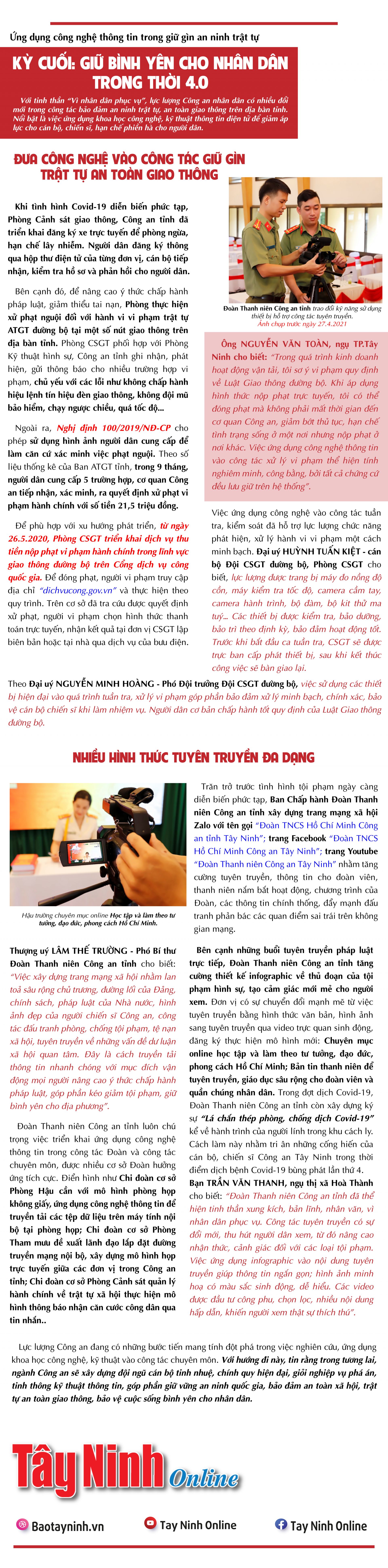 Với tinh thần “Vì nhân dân phục vụ”, lực lượng Công an nhân dân có nhiều đổi mới trong công tác bảo đảm an ninh trật tự, an toàn giao thông trên địa bàn tỉnh. Nổi bật là việc ứng dụng khoa học công nghệ, kỹ thuật thông tin điện tử để giảm áp lực cho cán bộ, chiến sĩ, hạn chế phiền hà cho người dân. |