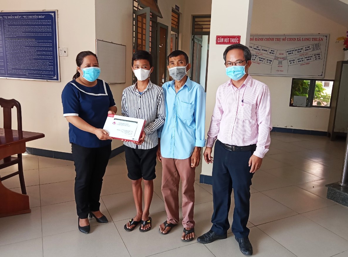 Phòng giao dịch NHCSXH huyện Bến Cầu tặng máy tính bảng cho học sinh khó khăn.
