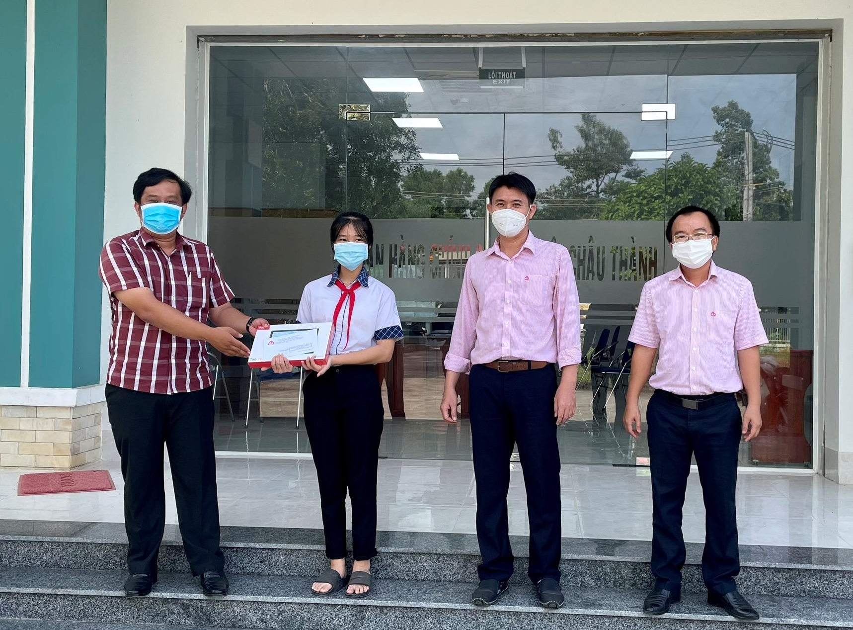 Phòng giao dịch NHCSXH huyện Châu Thành tặng máy tính bảng cho học sinh khó khăn.