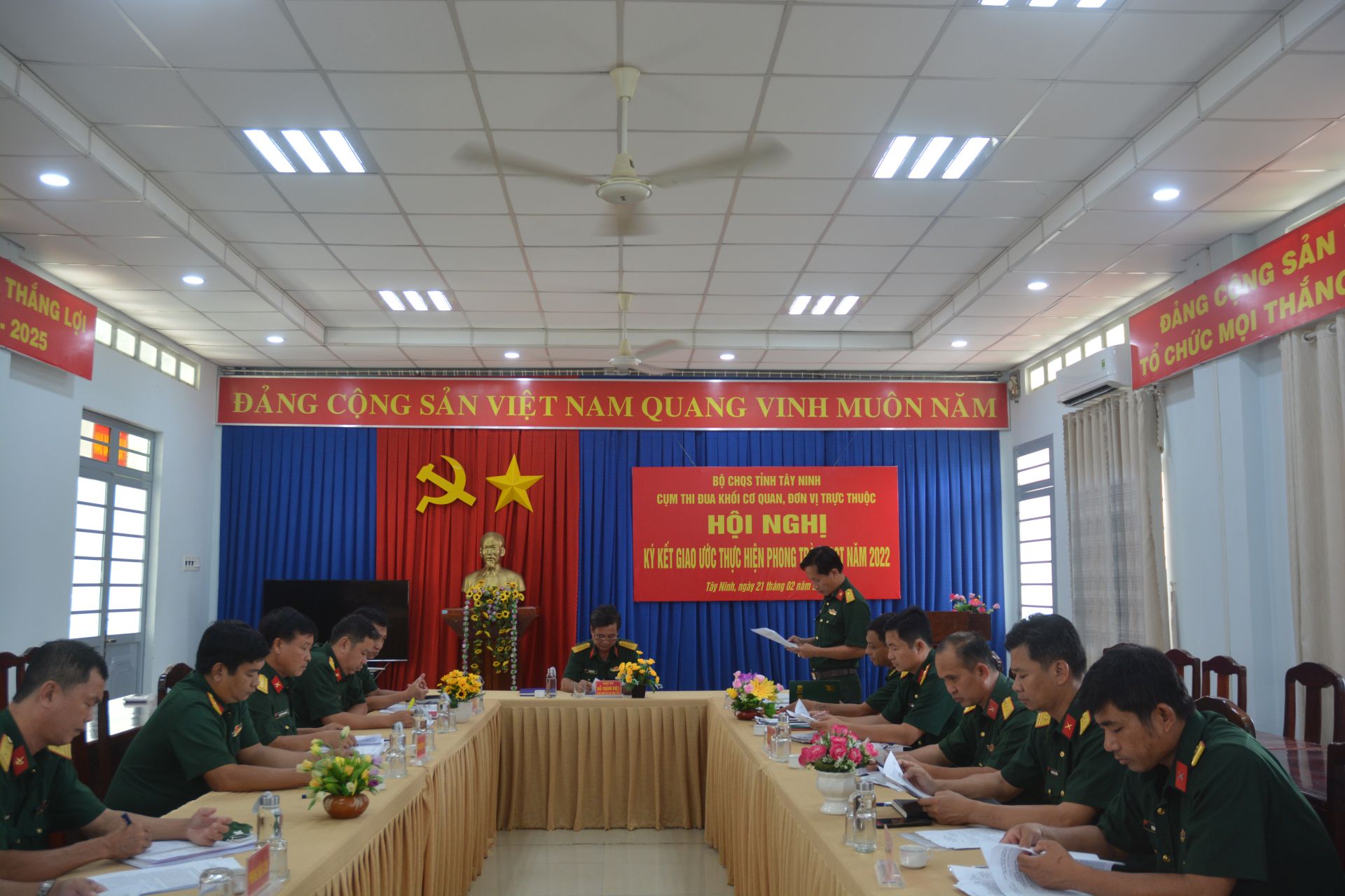 Chiều 21.2, tại Phòng Kỹ thật, cụm thi đua cơ quan, đơn vị trực thuộc Bộ CHQS tỉnh gồm các phòng: Tham mưu, Chính Trị, Hậu Cần, Kỹ thuật và Trung đoàn 174, Đội K71 tổ chức ký kết giao ước thực hiện phong trào thi đua quyết thắng năm 2022. Đại tá Đỗ Thành Việt- Phó Chính ủy Bộ CHQS tỉnh chủ trì hội nghị.