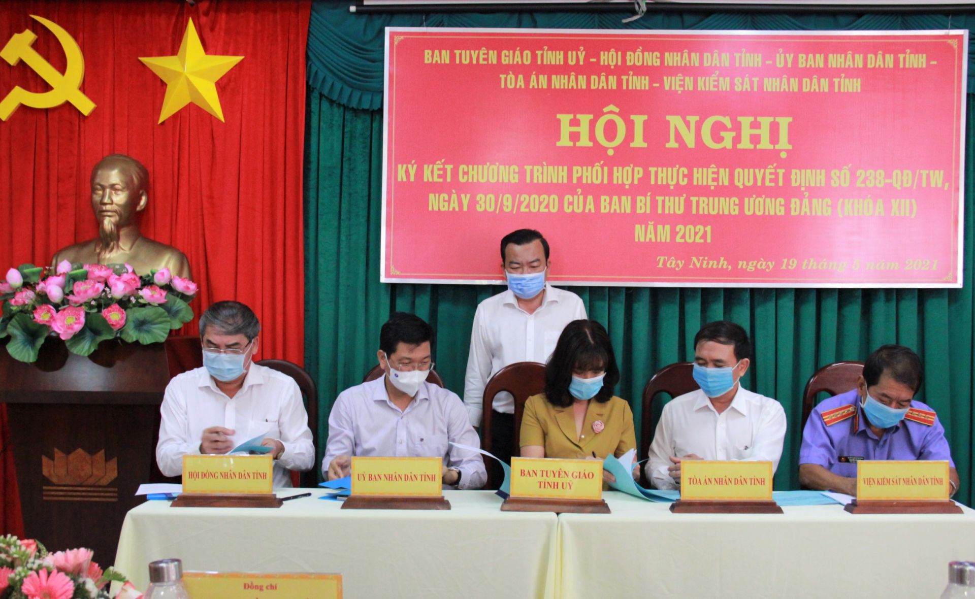 Ngày 19.5, Ban Tuyên giáo Tỉnh uỷ, HĐND, UBND tỉnh và Viện KSND, TAND tỉnh tổ chức hội nghị ký kết chương trình phối hợp thực hiện Quyết định số 238-QĐ/TW ngày 30.9.2020 của Ban Bí thư Trung ương Đảng (khoá XII) ban hành quy chế phối hợp giữa Ban Tuyên giáo các cấp với cơ quan nhà nước cùng cấp trong việc thực thi pháp luật, triển khai kế hoạch phát triển kinh tế - xã hội, giải quyết các vấn đề nổi cộm, nhân dân quan tâm năm 2021.