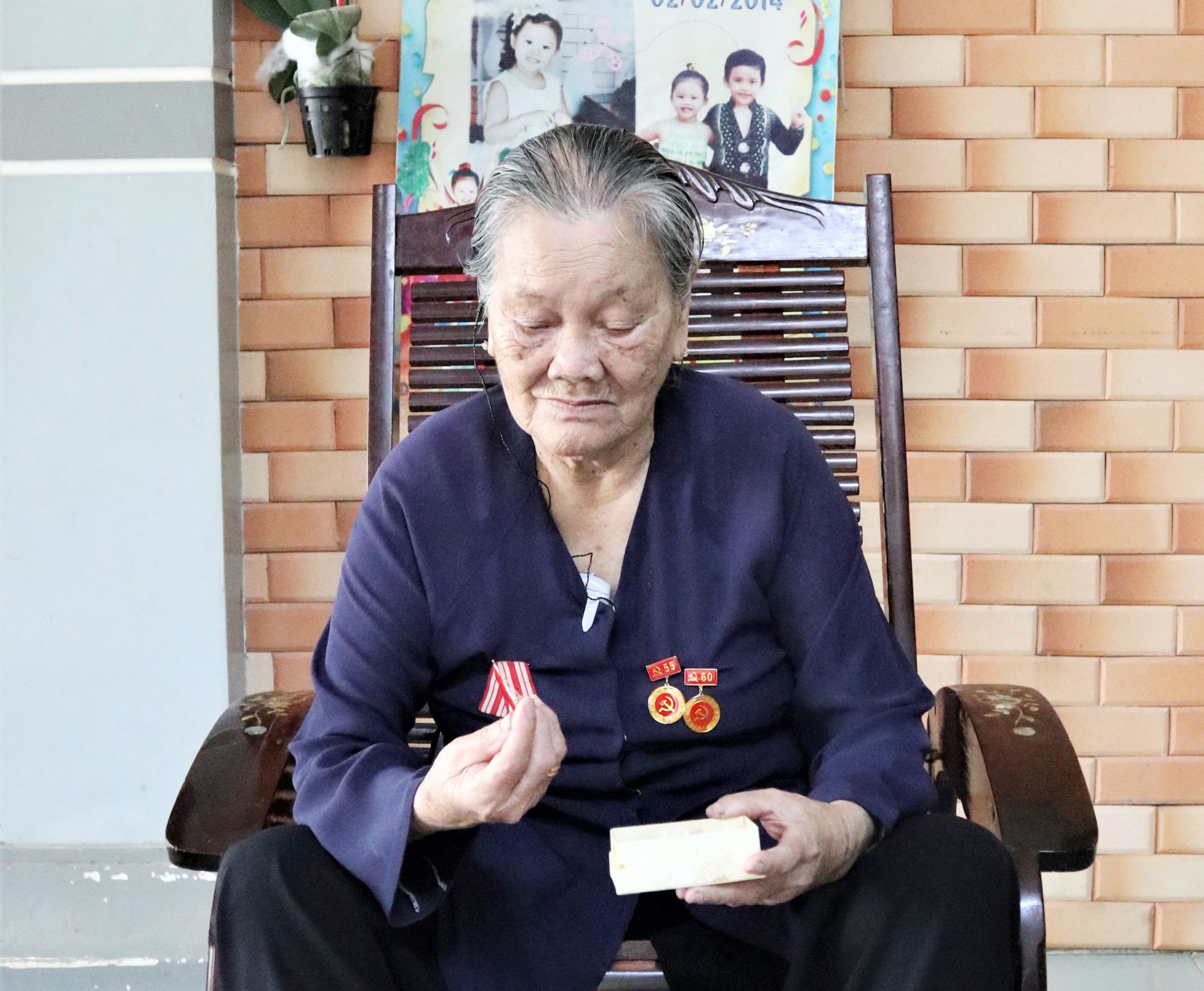 Bà Hai Rành xem lại những tấm Huân, Huy chương cao quý được Đảng, Nhà nước trao tặng.