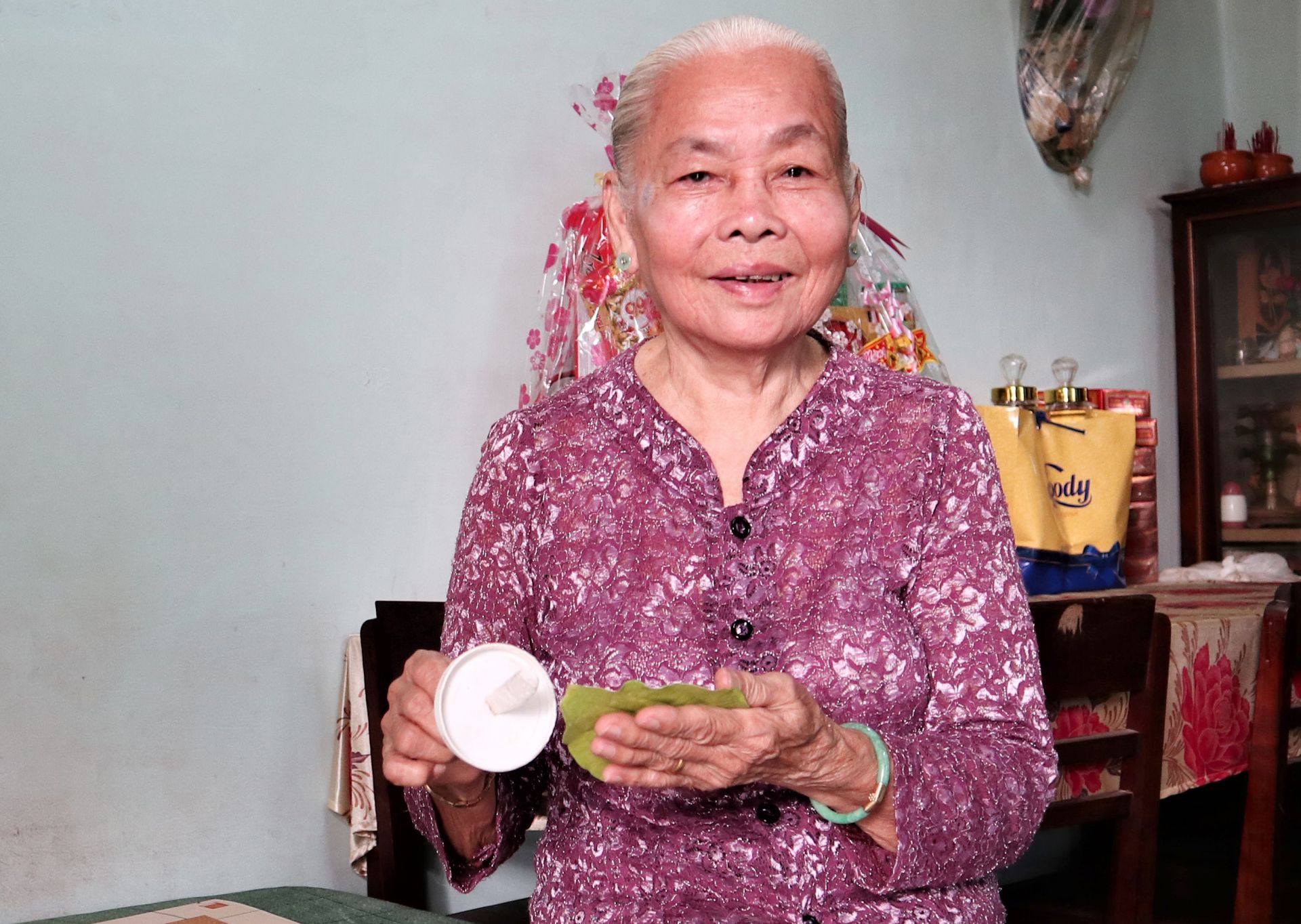 Nụ cười hiền hậu của bà Phạm Thị Tư khi têm trầu.