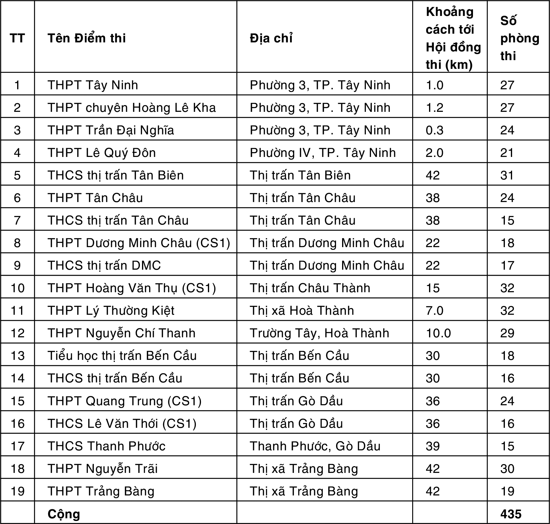 Tây Ninh có 19 điểm thi chính thức, 9 điểm thi dự phòng, được đặt tại các cơ sở giáo dục thuộc khu vực trung tâm của các huyện, thị xã, thành phố trong tỉnh. Khoảng cách từ hội đồng thi đến điểm thi xa nhất 42km, khoảng cách trung bình giữa các điểm thi 10km. Cụ thể như sau: