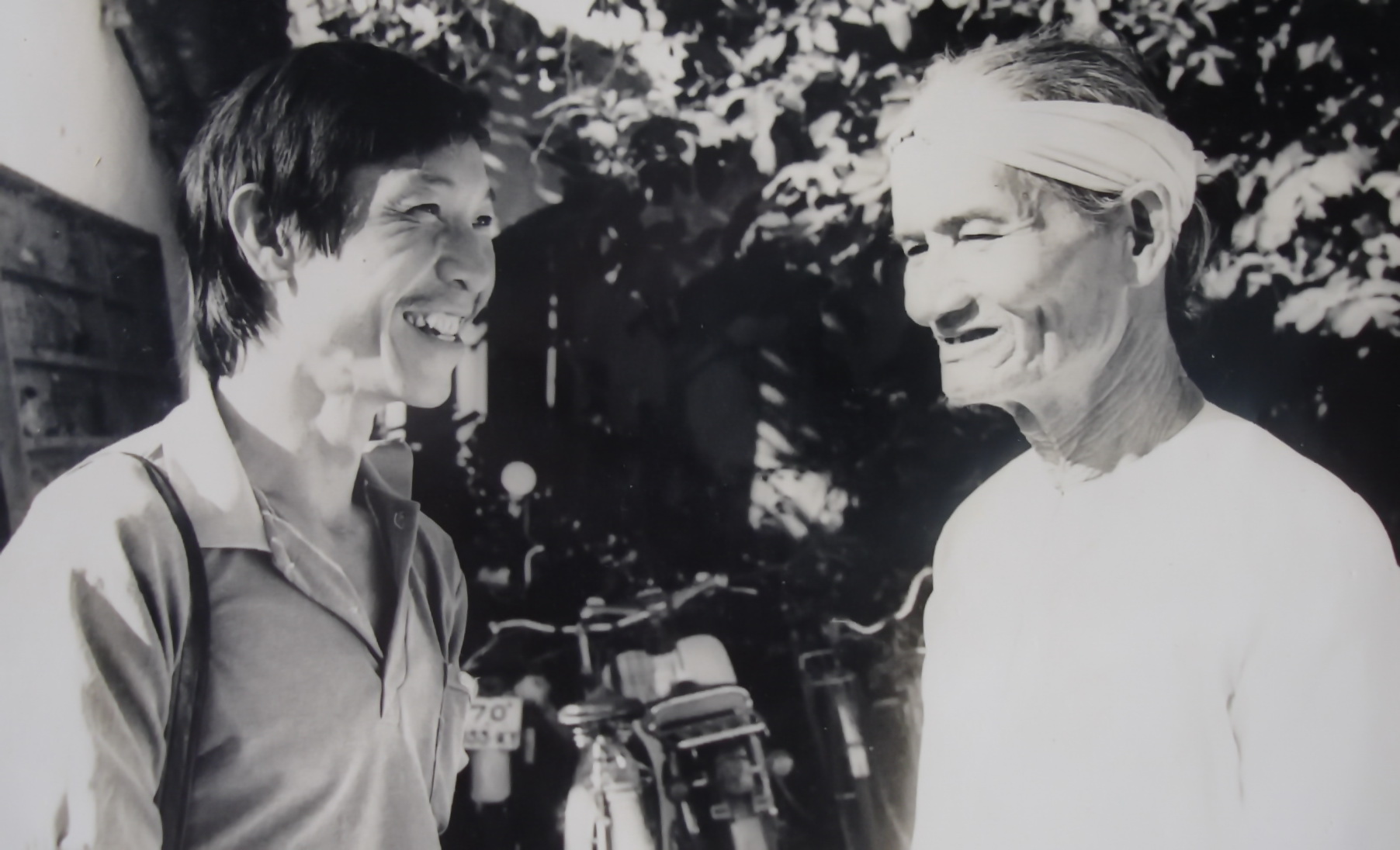 Tác giả chia vui cùng lão nông sau khi được trả lại 4 bánh xe bò (ảnh chụp năm 1988 tại sân Toà soạn Báo Tây Ninh cũ).