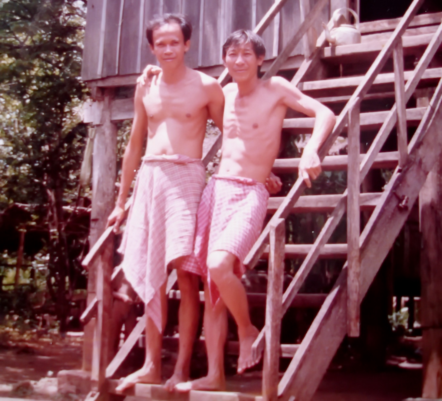 Tác giả (bên phải) cùng phóng viên Trần Việt trong chuyến tác nghiệp tại Campuchia (ảnh chụp năm 1989, tại một nhà dân ở Campuchia).