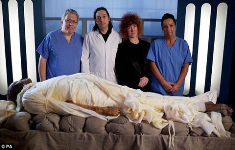 Các chuyên gia thực hiện ướp xác cho ông Alan đứng bên "thành phẩm" hoàn thiện |