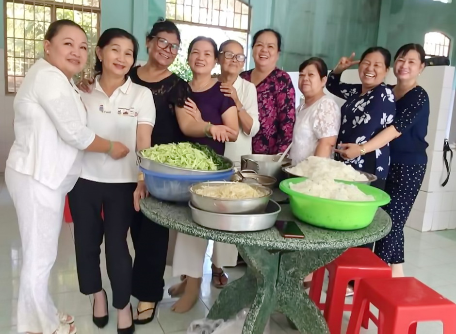 Bà Liễu (thứ ba, từ trái sang) cùng các thành viên của nhóm tham gia nấu ăn từ thiện.