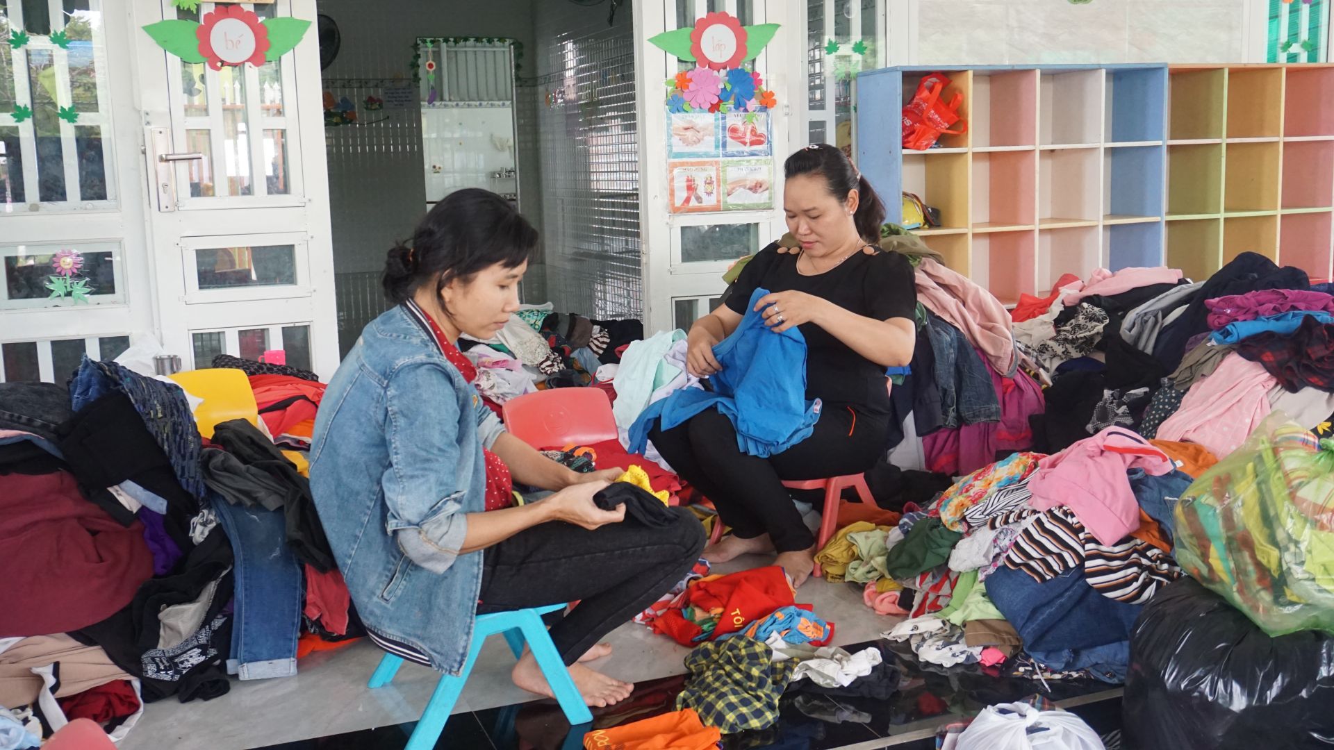 Các cô soạn quần áo rồi đóng gói, phân loại cẩn thận.