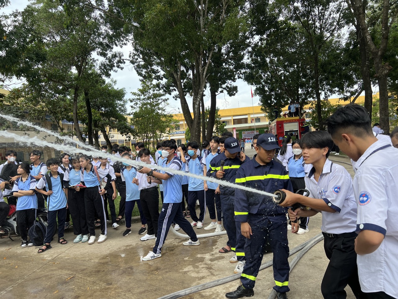 Các em học sinh trải nghiệm thực tế công tác PCCC và CNCH.