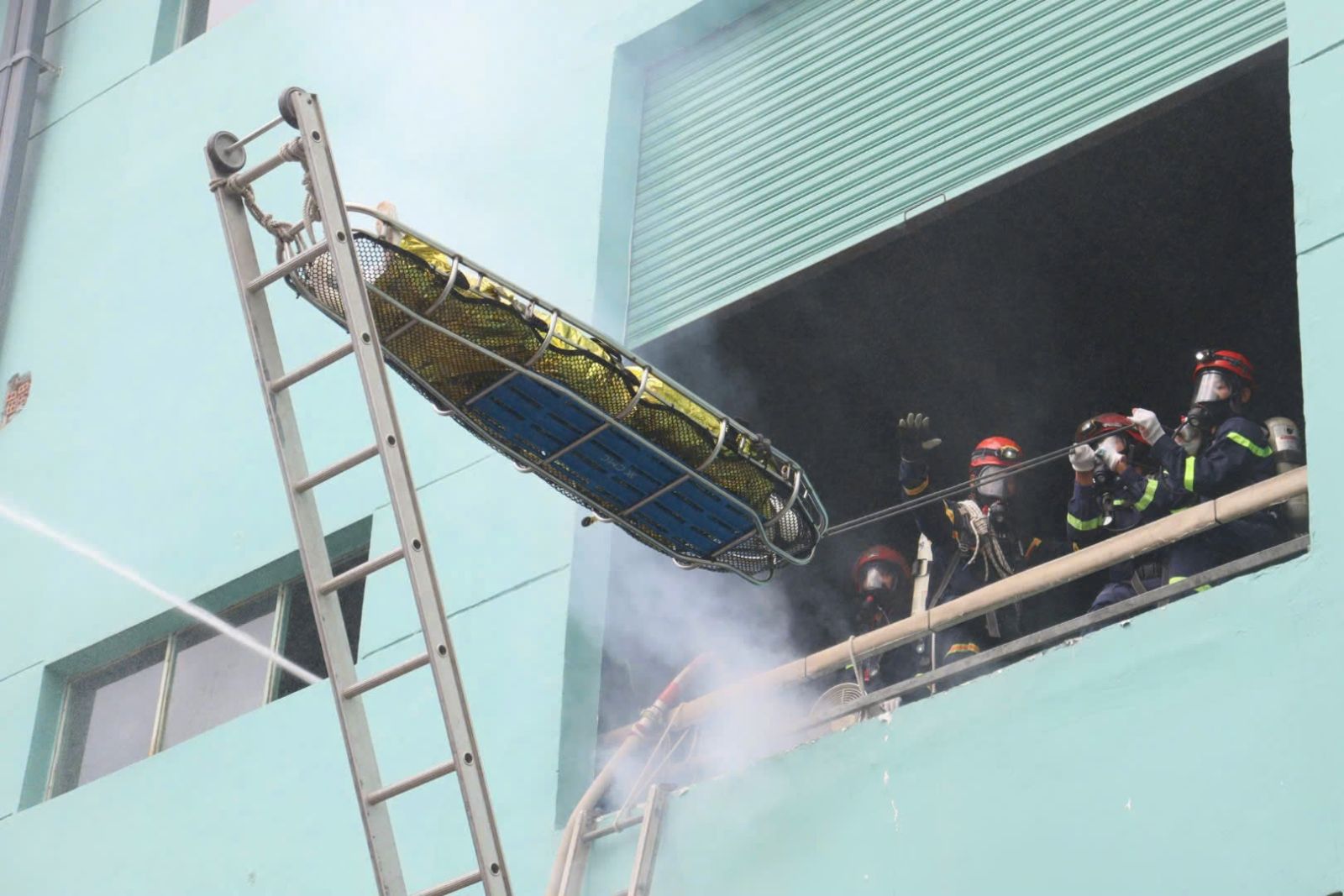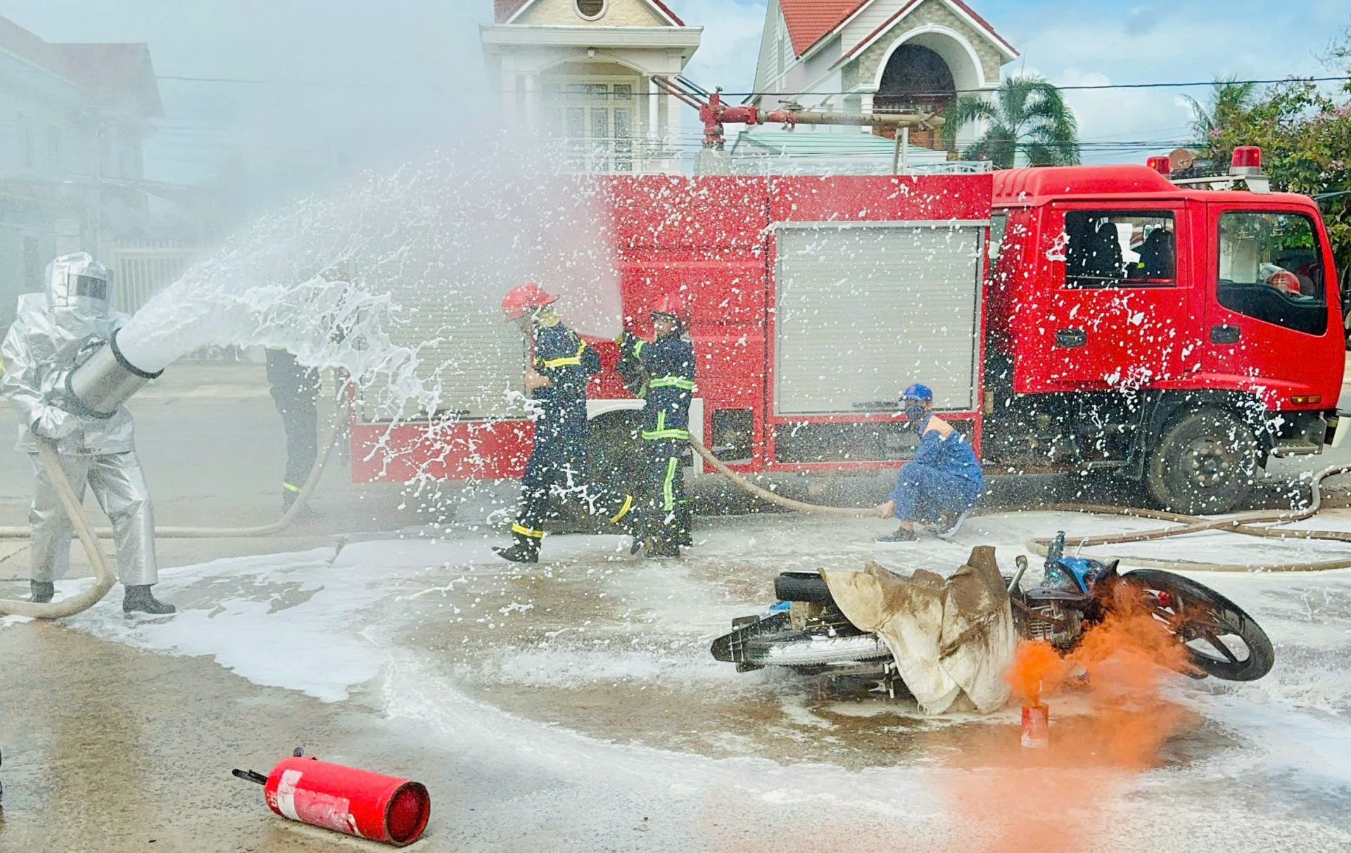 Thực tập phương án PCCC với sự tham gia của nhiều lực lượng.