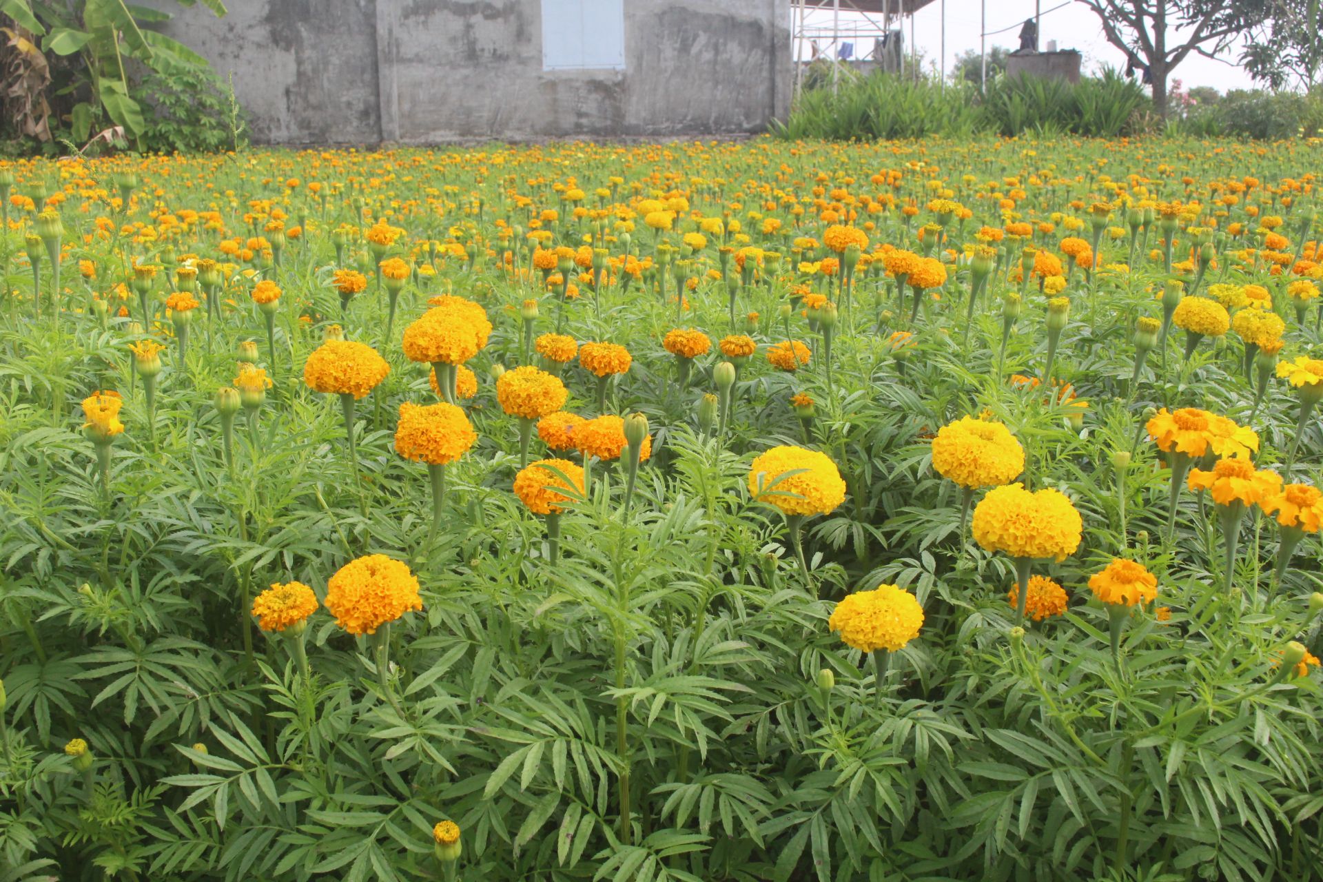 Năm nay, thời tiết có vẻ thuận lợi hơn mọi năm nên những ruộng hoa vạn thọ ở đây được dịp phát triển xanh tốt hơn, những nụ hoa bắt đầu hé nở, vàng rực cả cánh đồng.