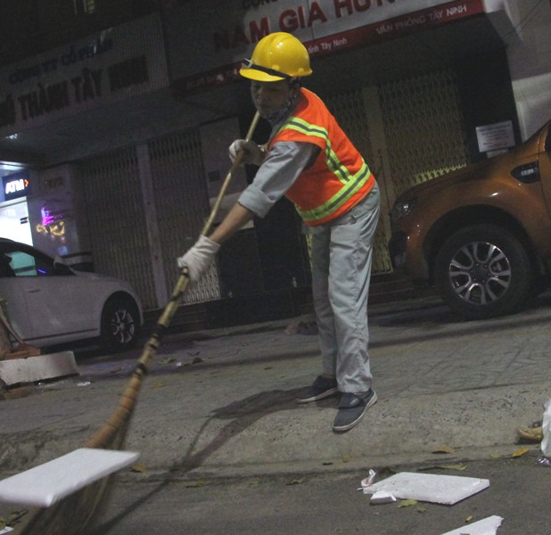 Theo quy định của Công ty Công trình đô thị Tây Ninh, 21 giờ hằng ngày, công việc quét dọn rác trên các tuyến đường của các chị mới bắt đầu. Tối nay, một chị xin nghỉ vì người thân ốm nên tổ 8, nơi chị Phan Thị Sâm, quê Hà Tĩnh và các đồng nghiệp làm việc chỉ còn 5 chị em. 5 chị em thực hiện việc quét dọn đường 30.4, đoạn từ vòng xoay giao lộ Cách Mạng Tháng Tám đến ngã ba Mũi Tàu.