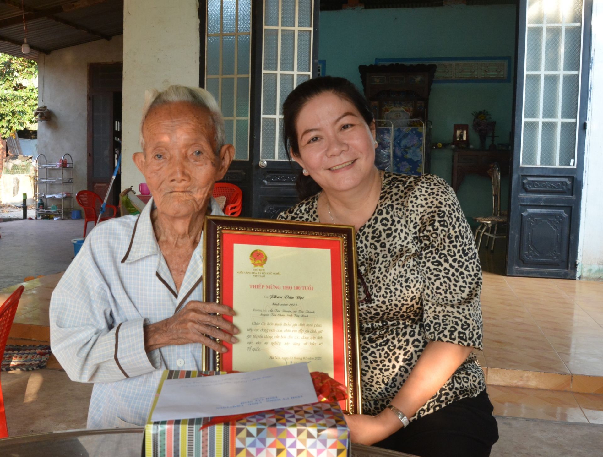 Bà Nguyễn Thị Phượng- Phó Chủ tịch UBND huyện Tân Châu trao quà cho ông Phan Văn Đợi, công dân tròn 100 tuổi.