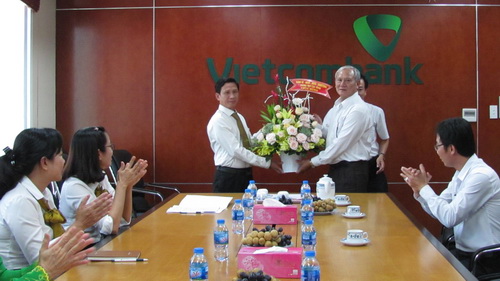 Ông Võ Minh Hùng- Chủ nhiệm UBKT Thành ủy trao hoa chúc mừng Vietcombank chi nhá Tây Ninh.