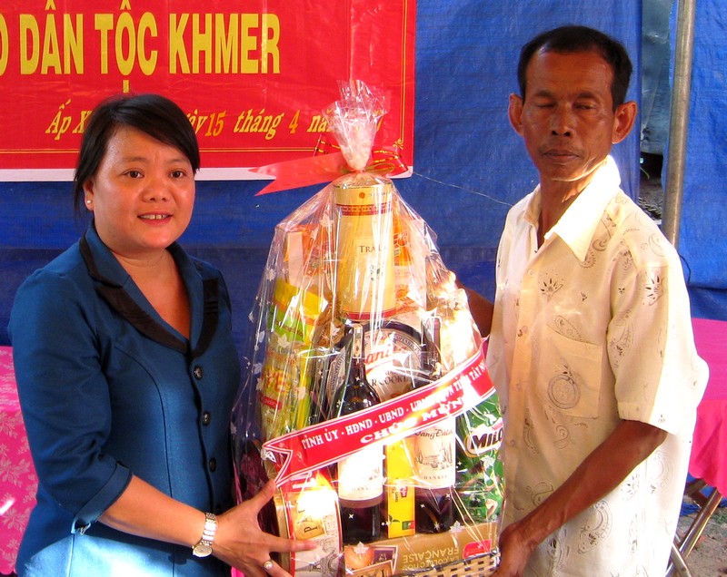 Bà Phan Thị Hồng Đào- Phó chủ tịch LĐLĐ tỉnh trao quà cho đại diện bà con dân tộc Khmer ấp Xóm Tháp. |