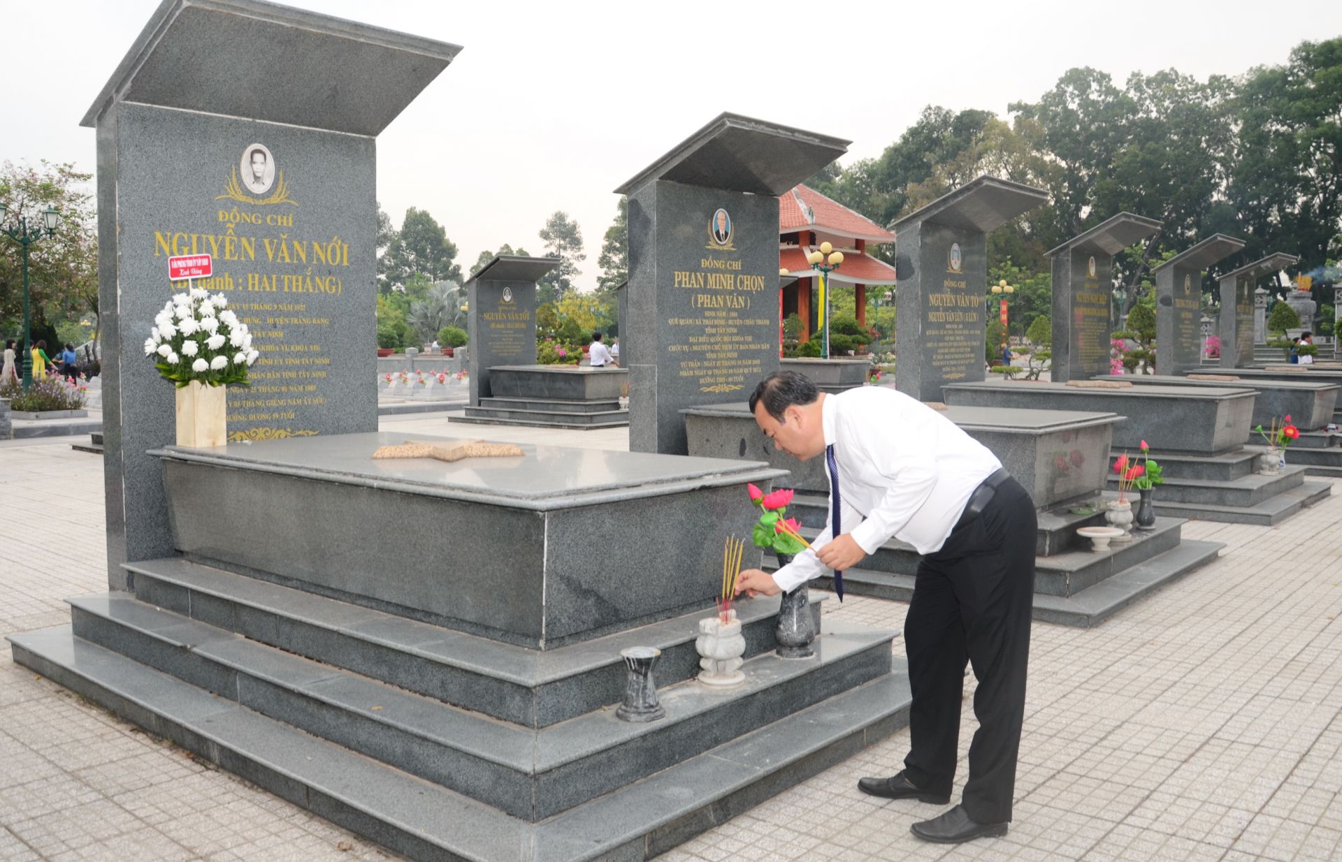 Bí thư Tỉnh uỷ Nguyễn Thành Tâm thắp hương các phần mộ anh hùng, liệt sĩ tại Nghĩa trang liệt sĩ Trà Võ.