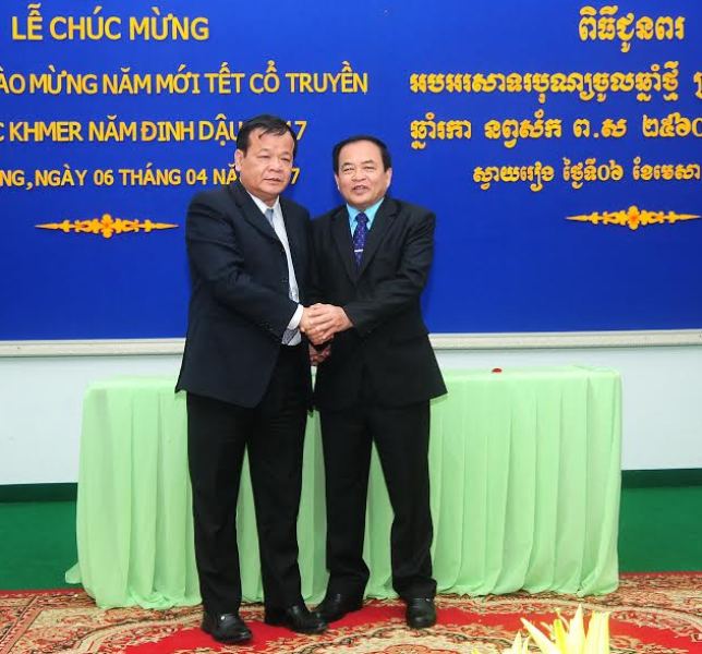 Chủ tịch UBND tỉnh Tây Ninh Phạm Văn Tân chúc tết Ngài MenVich Bol- Tỉnh trưởng tỉnh Svay Rieng. |