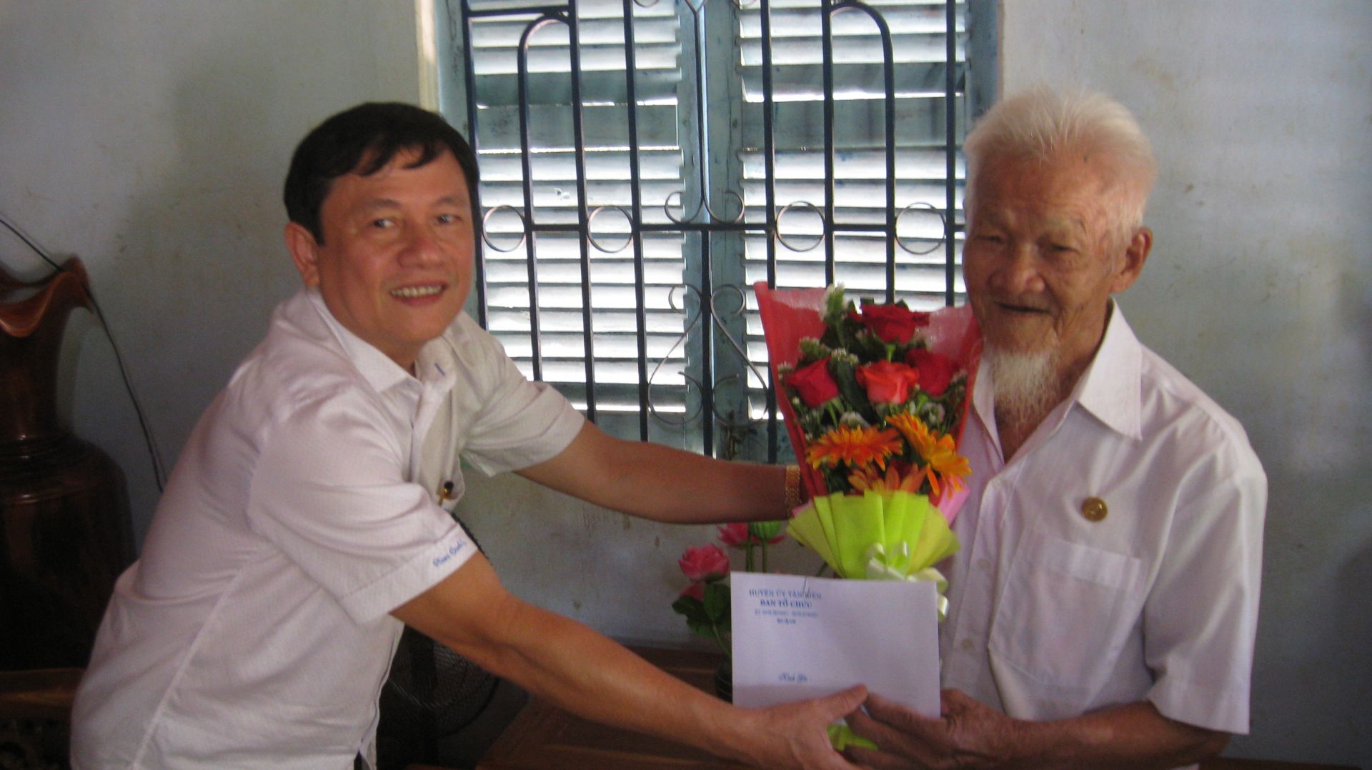 Ông Võ Văn Sớm- Chủ nhiệm Ủy ban kiểm tra Tỉnh ủy tặng hoa mừng thọ đảng viên Đặng Công Tỉnh.