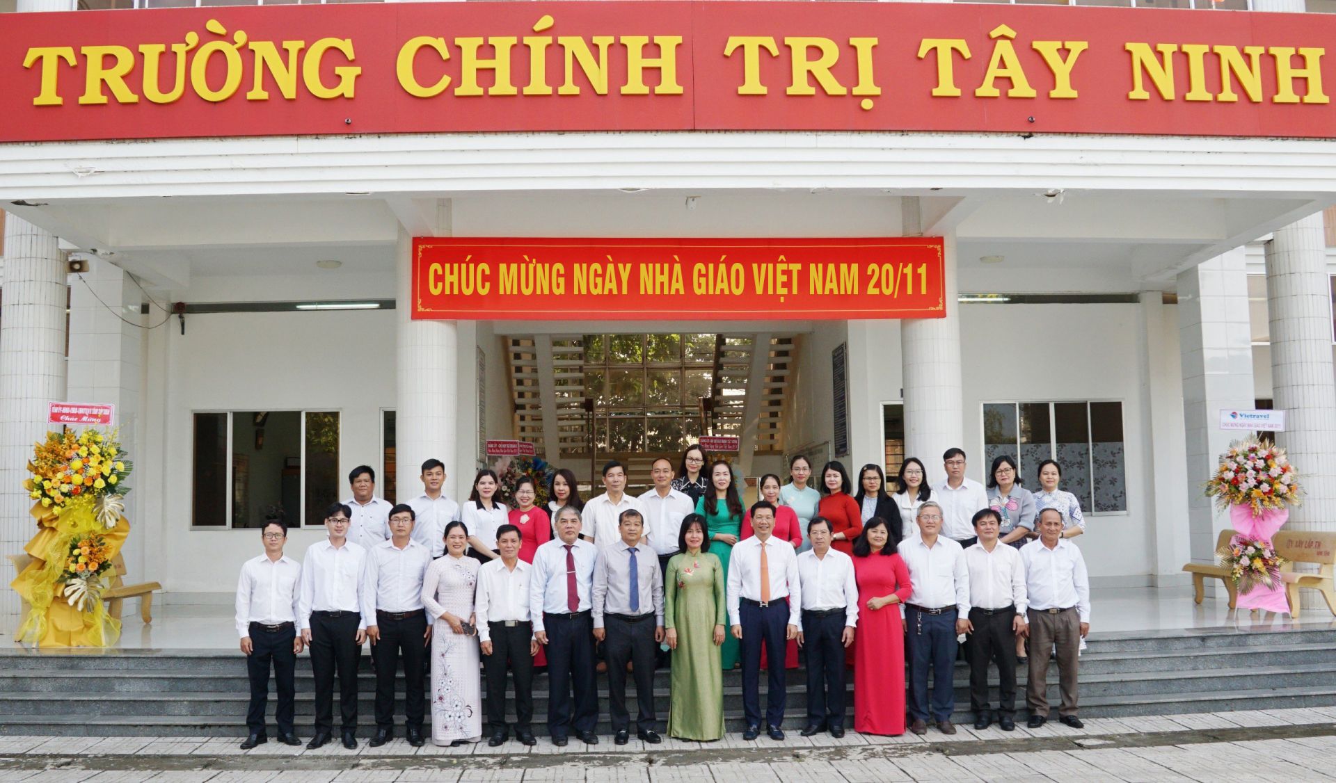 Đoàn cán bộ lãnh đạo tỉnh chụp ảnh lưu niệm với cán bộ, giảng viên, nhân viên Trường Chính trị tỉnh. Ảnh Tố Tuấn