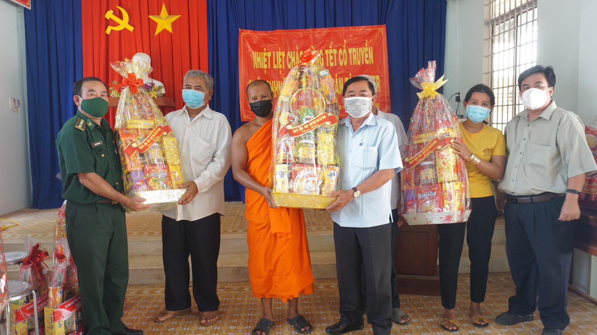 Đại diện các ban, ngành tỉnh tặng quà cho Ban Trị sự Chùa Kà Ốt, những người có uy tín tại xã Tân Đông.