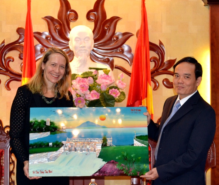 Bí thư Tỉnh ủy Trần Lưu Quang tặng bức tranh hồ Dầu Tiếng cho bà Mary Tarnowka.