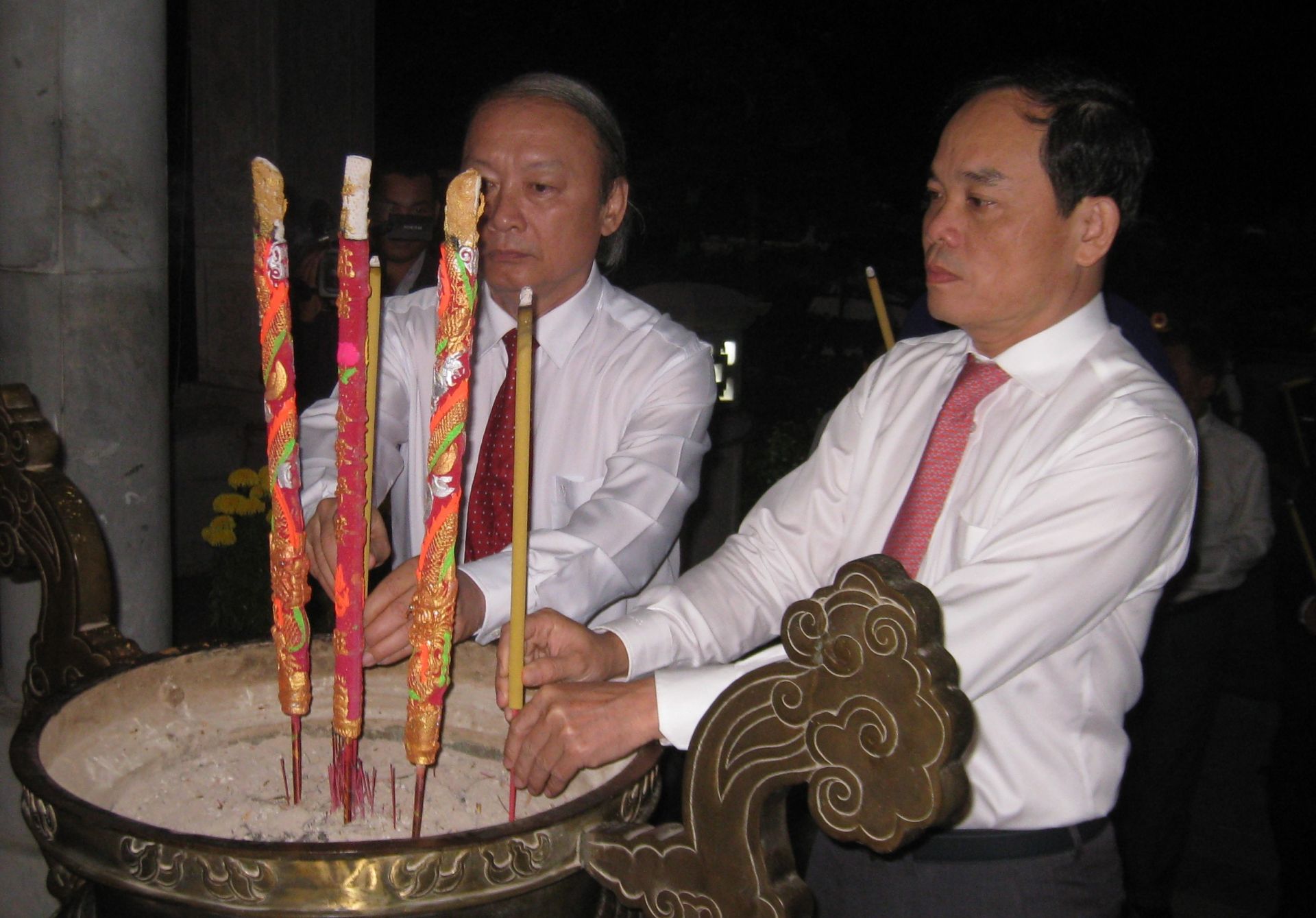 Phó Trưởng Ban Tuyên giáo Trung ương Võ Văn Phuông, Bí thư Tỉnh uỷ Tây Ninh Trần Lưu Quang thắp hương tưởng niệm các anh hùng liệt sĩ.