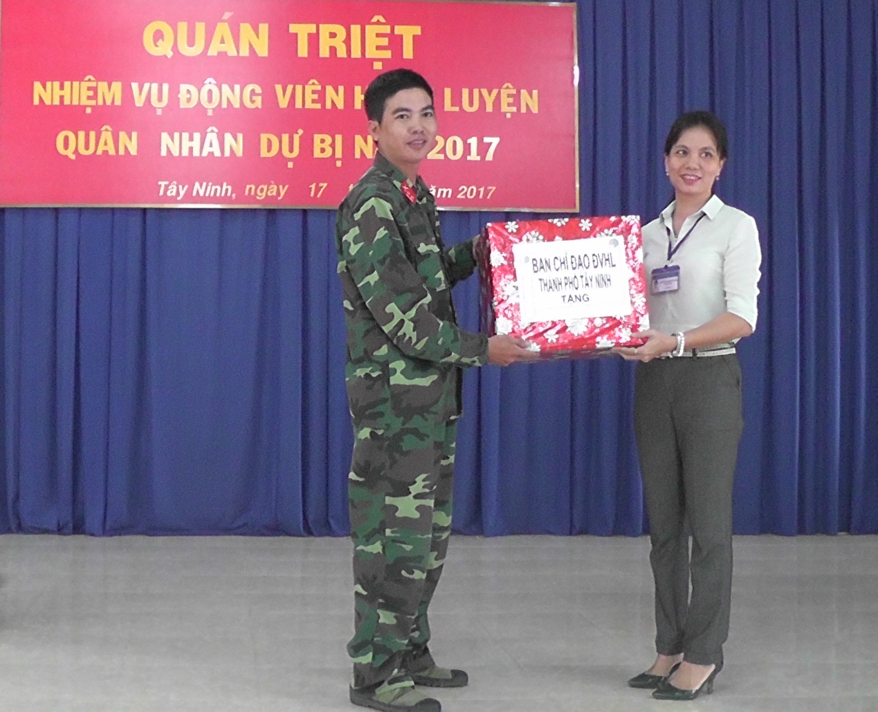 | Bà Nguyễn Thị Hoàng Oanh – Phó Chủ tịch UBND Thành phố Tây Ninh tặng quà cho đại diện các chiến sĩ quân nhân dự bị Đại đội 1, Tiểu đoàn Bộ binh Thành phố. |