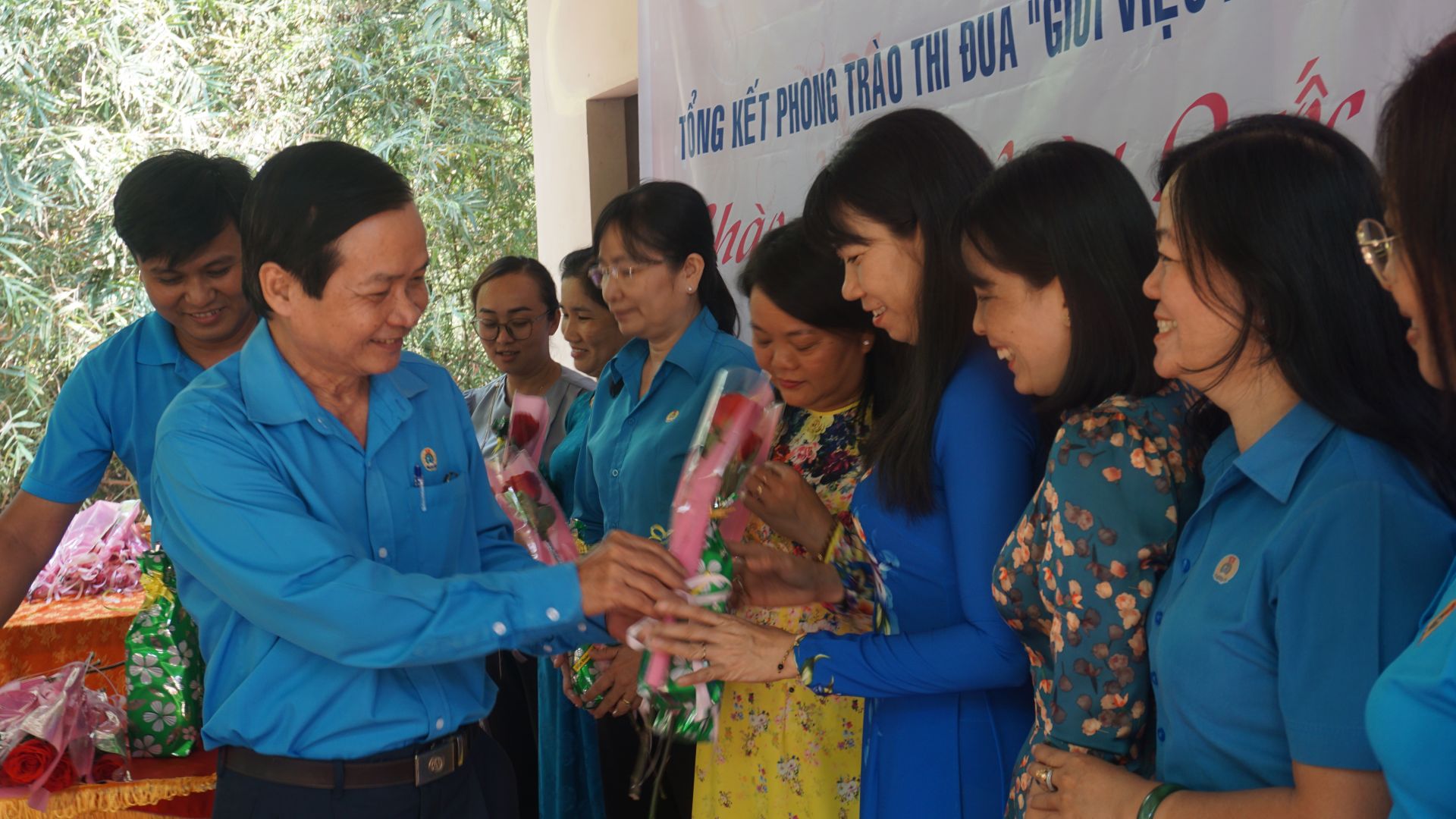 Ông Phan Văn Bua- Phó Chủ tịch LĐLĐ tỉnh tặng hoa cho nữ cán bộ Công đoàn.