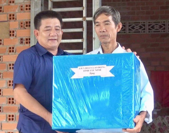 Ông Võ Văn Dũng- Chủ tịch LĐLĐ tỉnh trao quà cho ông Nguyễn Văn Dẫn.