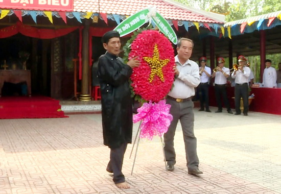 Đại diện lãnh đạo xã Cẩm Giang và Ban Hội đền thực hiện nghi thức dâng hoa tại lễ giỗ Quan đại thần Huỳnh Công Thắng.